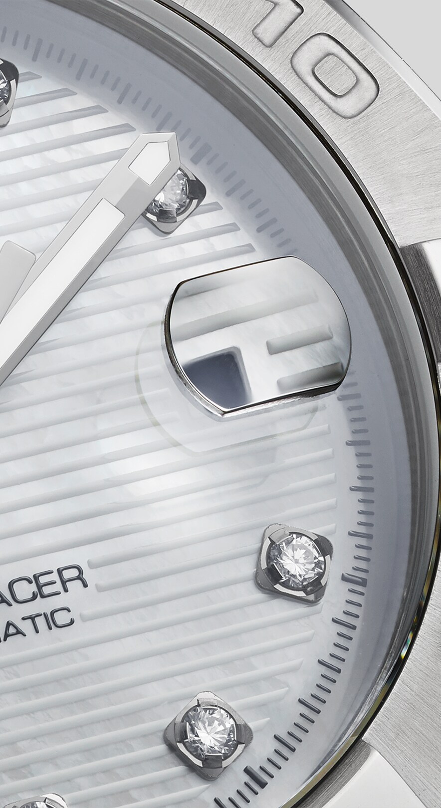 Automatic, 32 mm, Steel WBD2313.BA0740Diamond-enriched glamour in a 32mm steel case. The Calibre 9 automatic movement beats beneath a white mother-of-pearl dial with alluring stripes decoration. A cyclops magnifying lens graces the sapphire crystal, which is anti-reflectiv and highly resistant.