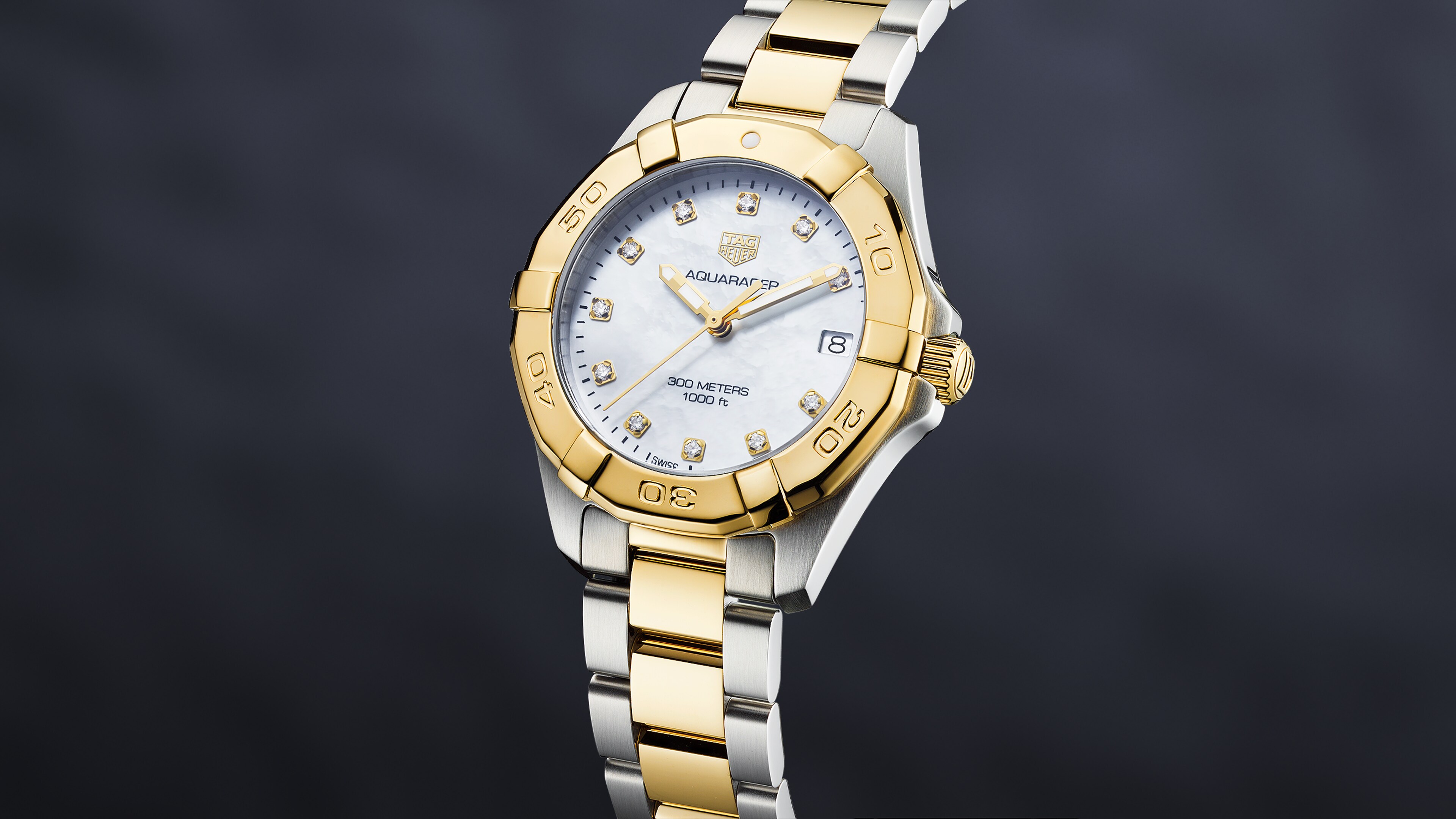 The TAG Heuer shield, the three polished and facetted hands are plated in 18K 2N yellow gold. Water-resistant to 300 meters, it is at once very robust, suitable for all challenges, and glamour.
