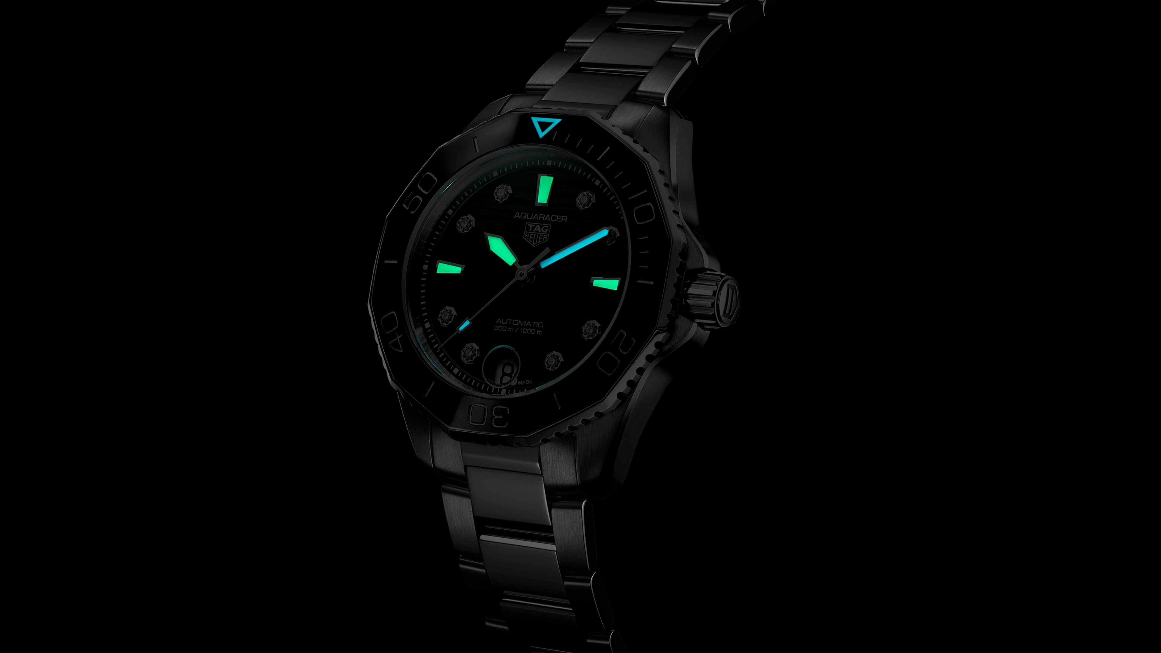 The TAG Heuer Aquaracer seamlessly merges a pressure-proof, finely-brushed, and polished stainless steel 36 mm case with a black ceramic bezel, ensuring its water resistance up to 300 metres.