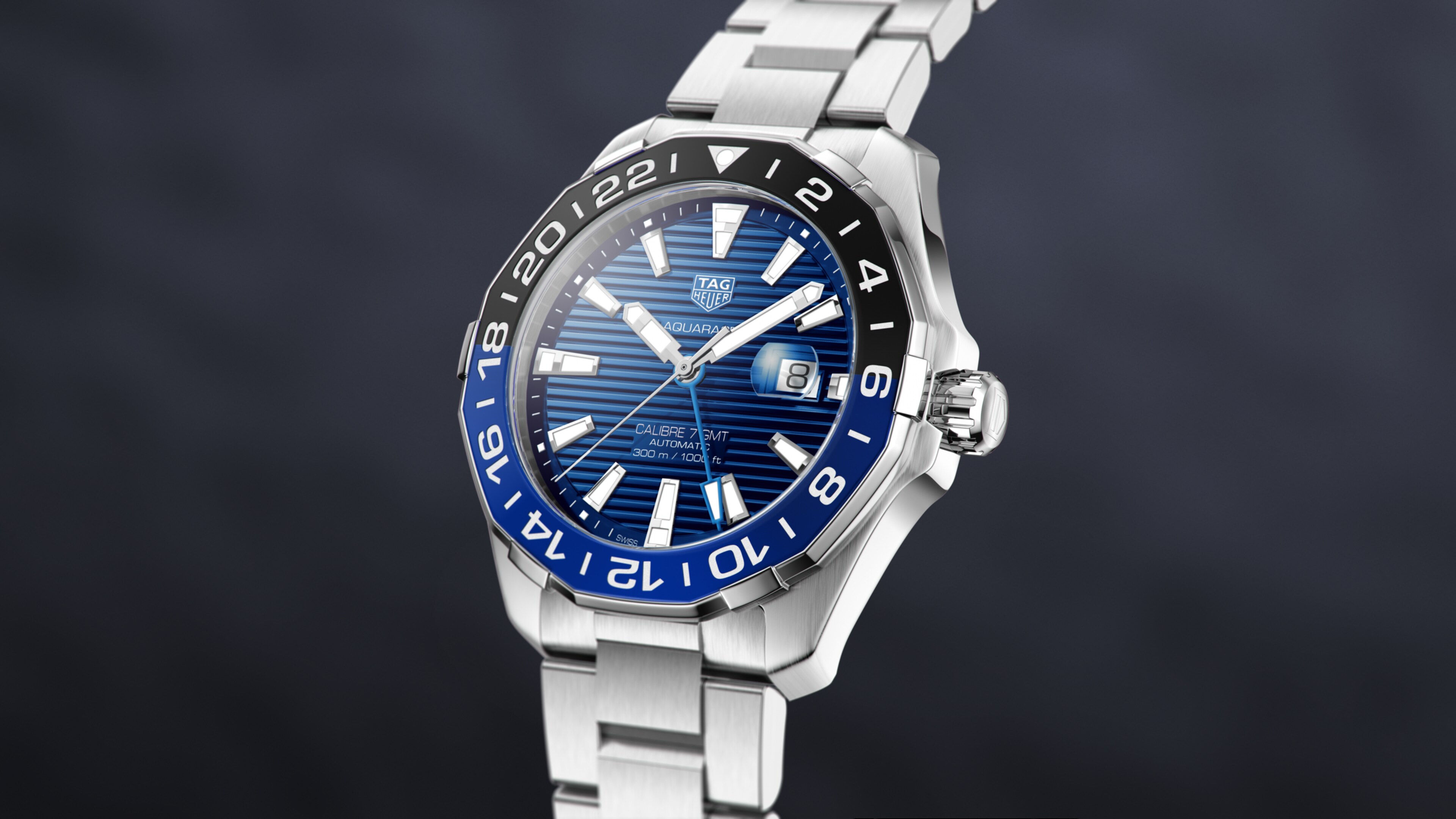 Automatic, 43 mm, Steel WAY201T.BA0927A stainless-steel Aquaracer GMT with stunning blue sunray brushed dial, powered by the Calibre 7. Life-proof, up for every challenge, this is the perfect everyday watch, functional and elegant, reliable in all conditions.