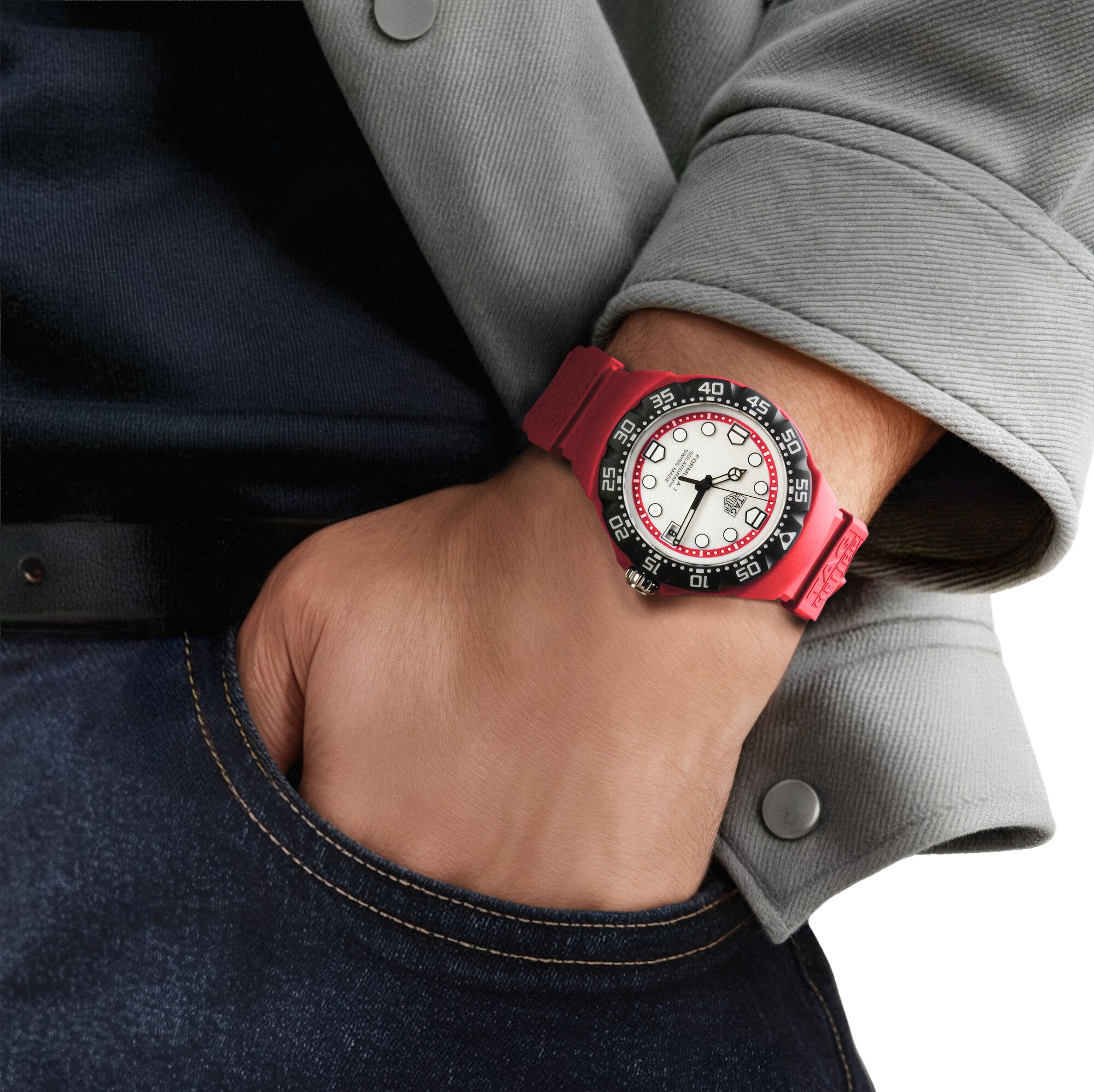 The white opalin dial is framed by a dynamic red flange and a black TH-Polylight bezel, while the black lacquered hands and indexes, coated with eggshell Super-LumiNova®, stand out vividly.