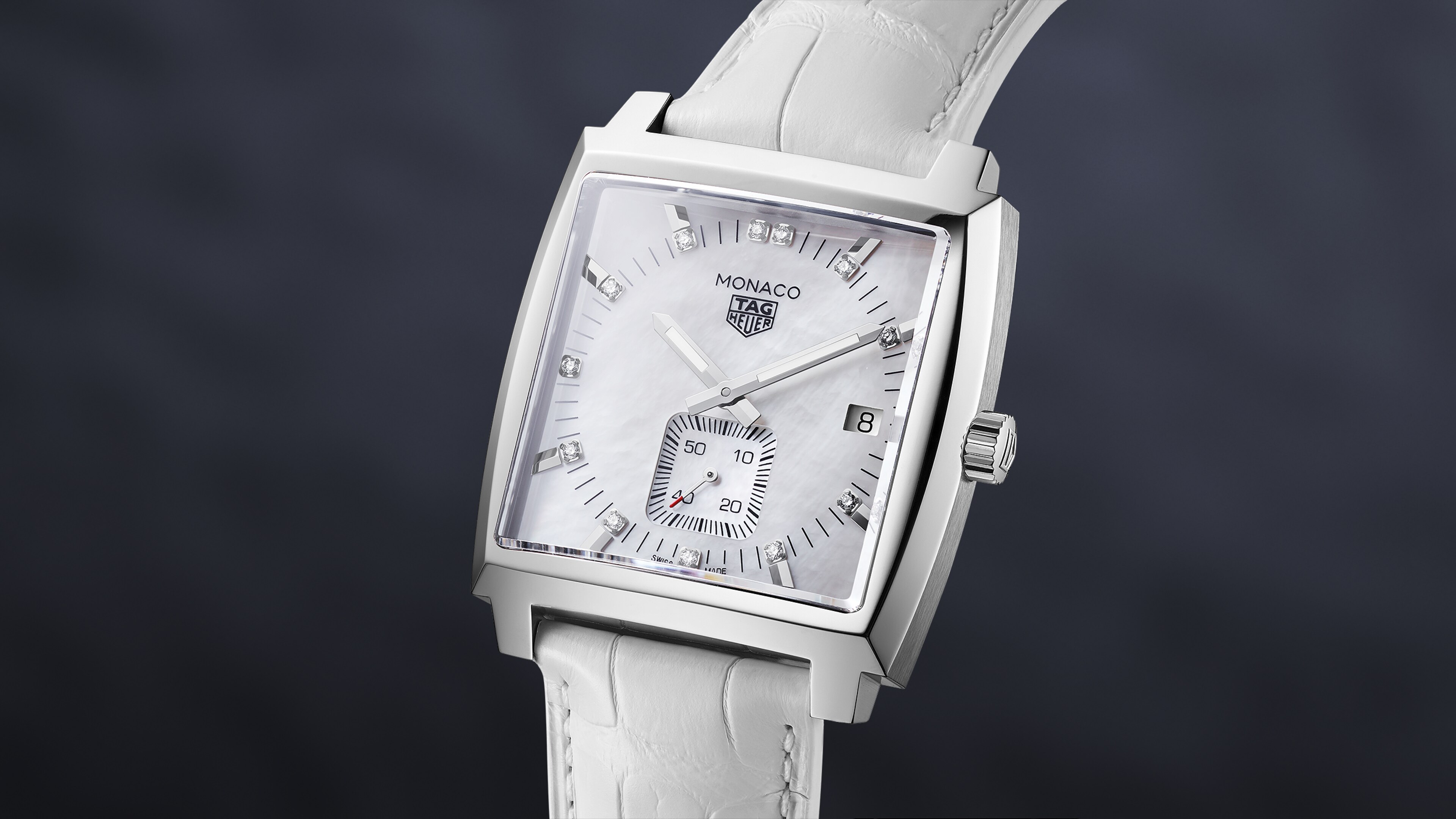 Quartz, 37 mm, Steel WAW131B.FC6247A serious piece of head-turning eye candy: 12 white diamonds on a white mother-of-pearl dial and an on-trend, very feminine strap in white alligator. The distinctive 37mm square-shaped case is in polished steel, as is the crown at 3 o'clock. The most glamorous Monaco yet.