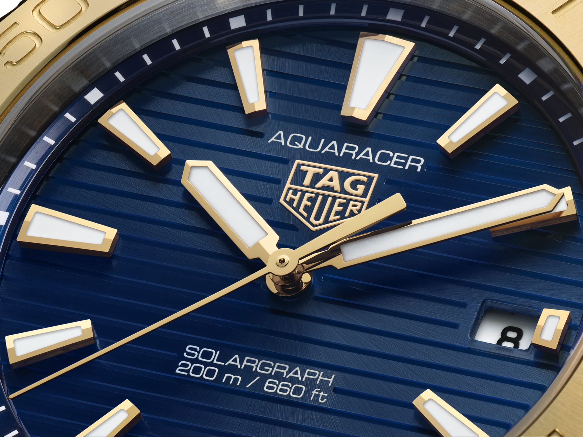 The stunning blue sunray brushed dial is complemented by indexes and hands plated with 18K 2N yellow gold and filled with white Super-LumiNova®, ensuring maximum legibility and reliability in all conditions.