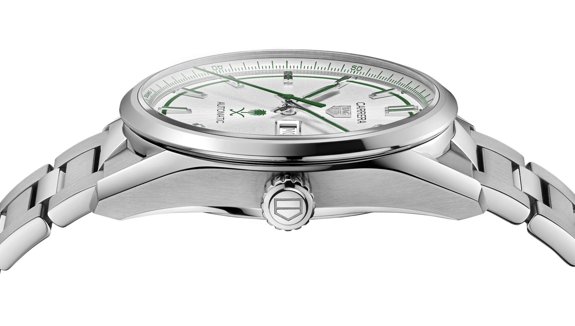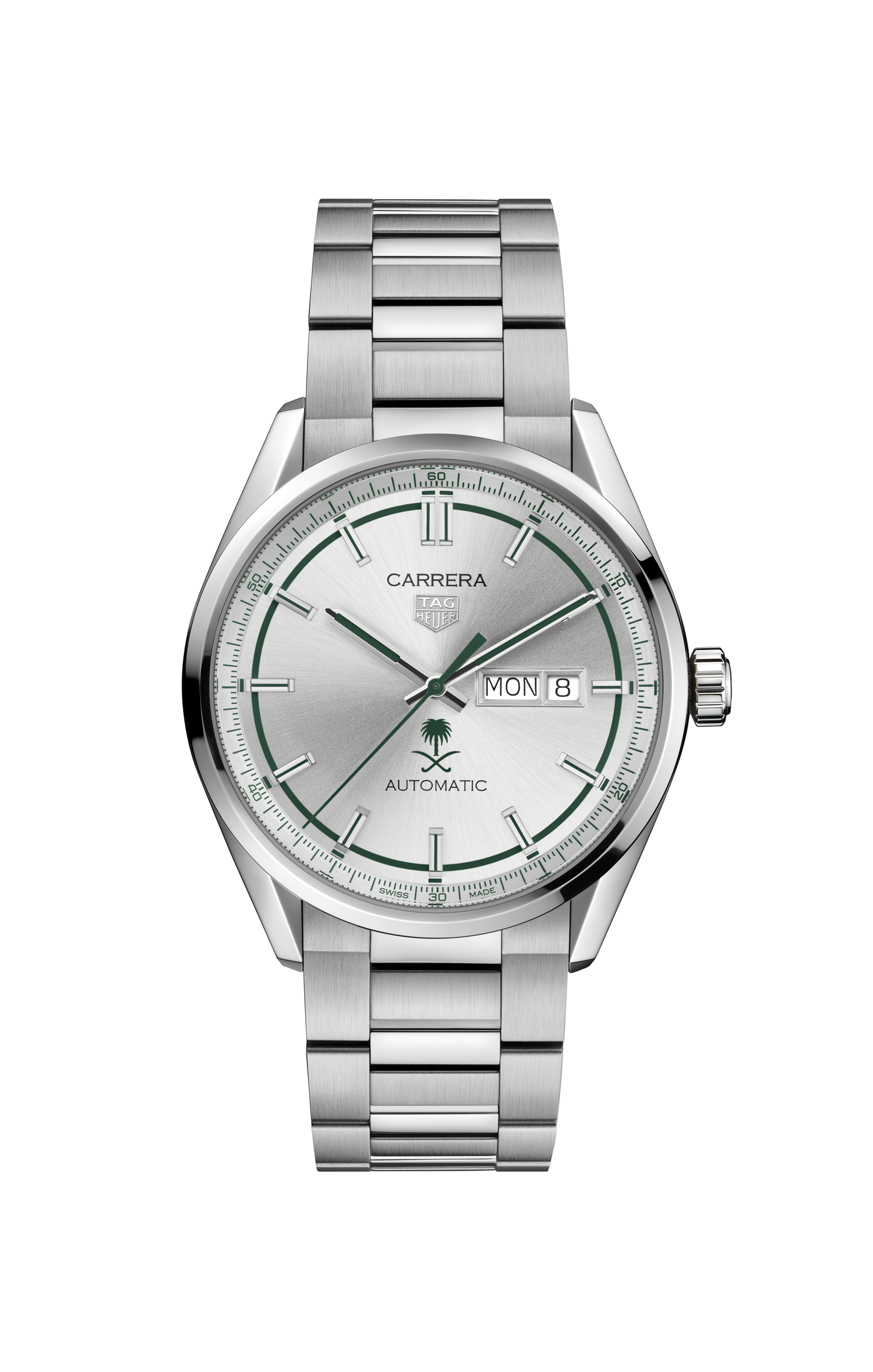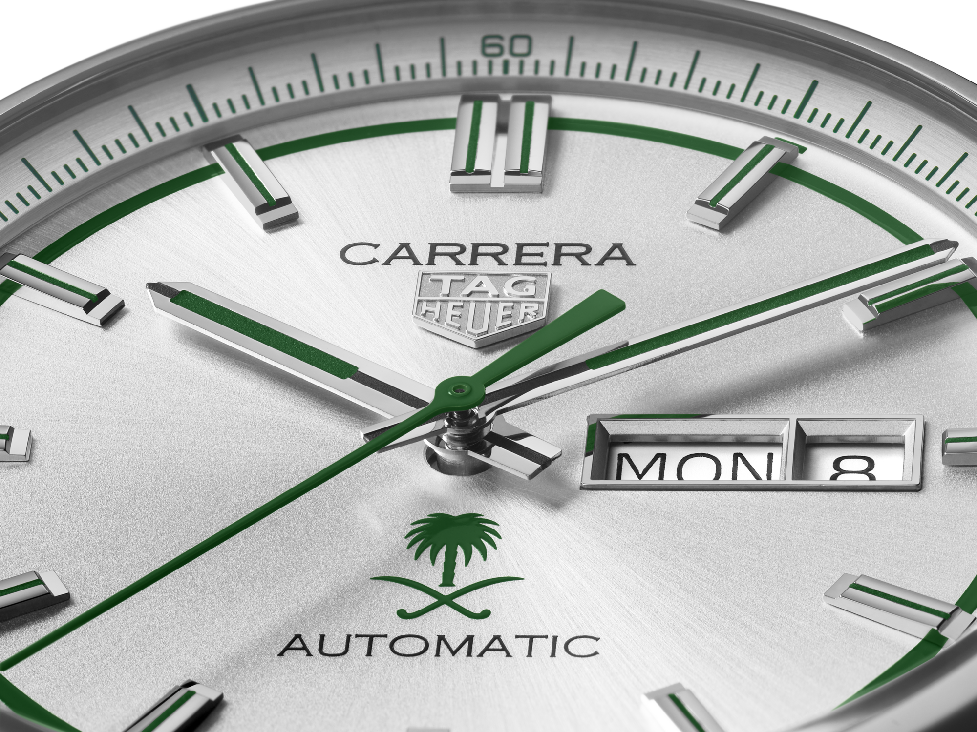 泰格豪雅卡莱拉系列沙特阿拉伯限量版腕表,直径41毫米,优雅与现代风格兼具的典范杰作。 作品处处尽显沙特要素,表盘饰有沙特国徽,并精心覆以标志性的沙特绿色。