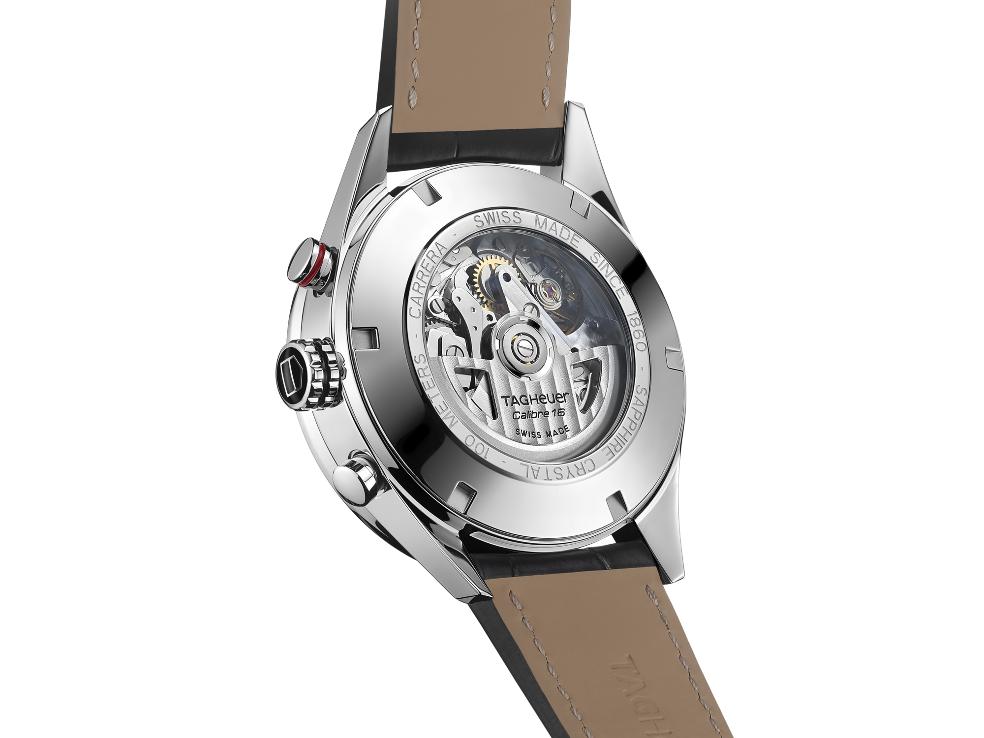 这款自动计时码表配备星期日历显示复杂功能。 以赛车运动为灵感源泉,并采用3-6-9计时盘布局设计,由Calibre 16机芯提供动力,透过蓝宝石表背可欣赏其运行美态。 搭配黑色鳄鱼皮表带。