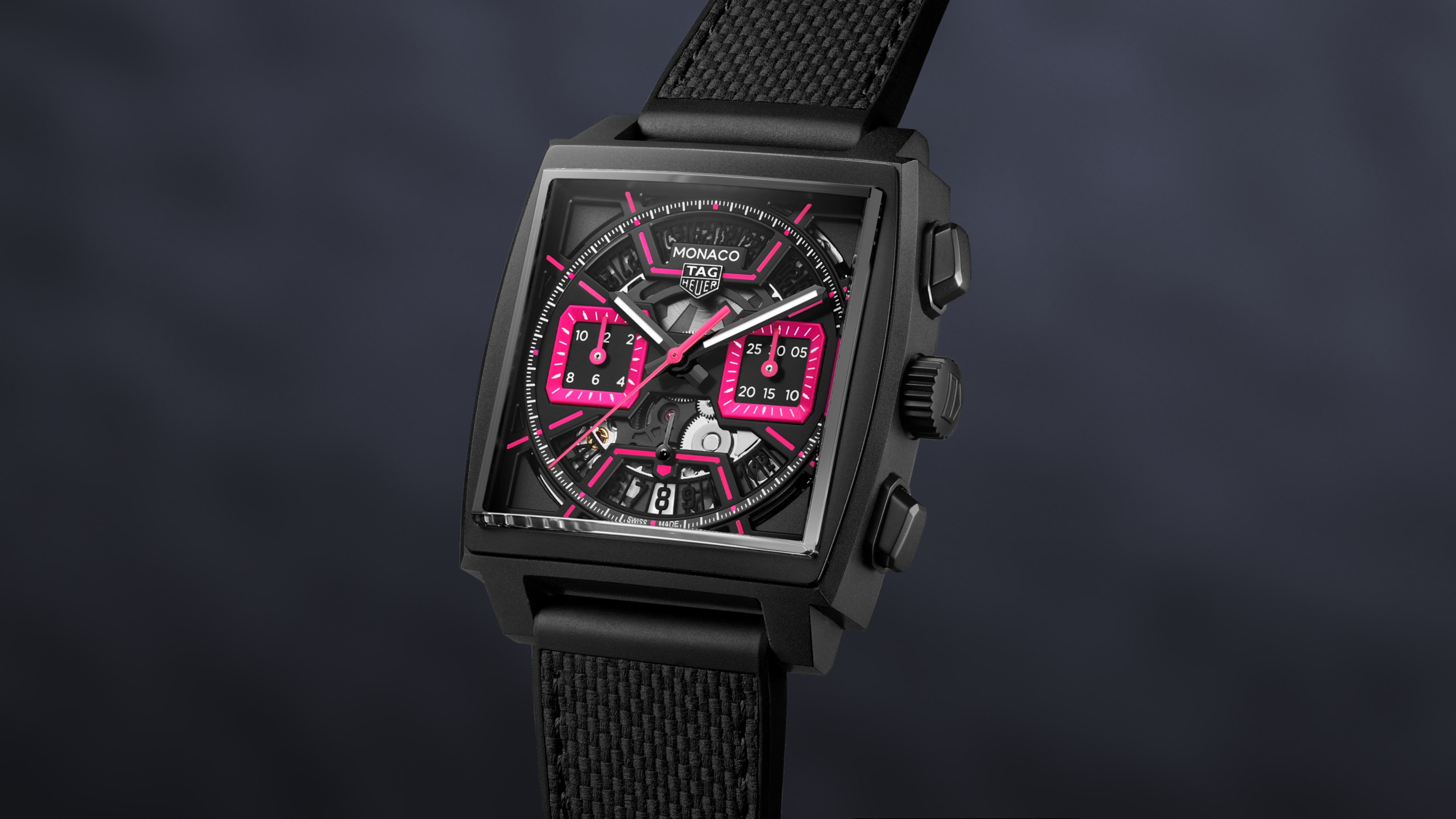 自動, 39 mm, DLC塗層鈦金屬 CBL218B.FT6236與此前衛的TAG Heuer Monaco(摩納哥)腕錶一同踏入大膽創新的世界。這款腕錶以當代風格演繹經典作品,將亮麗粉紅和時尚黑色融入至矚目的鏤空設計,體現現代先驅的無畏精神。