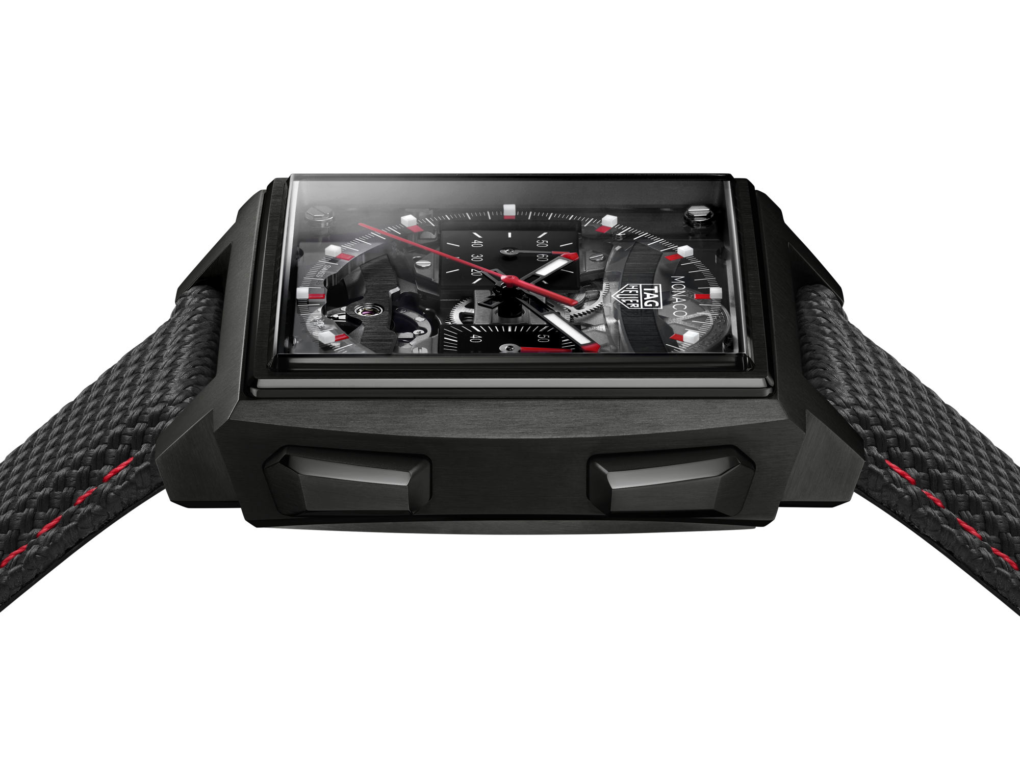 40毫米的5級鈦金屬錶殼輕盈矚目,糅合人體工學設計和鮮明視覺效果。方形藍寶石水晶玻璃錶背搭配帶有標誌性飾面的方形機芯,而襯以織物壓印和紅色縫線的黑色橡膠錶帶盡現賽車格調。