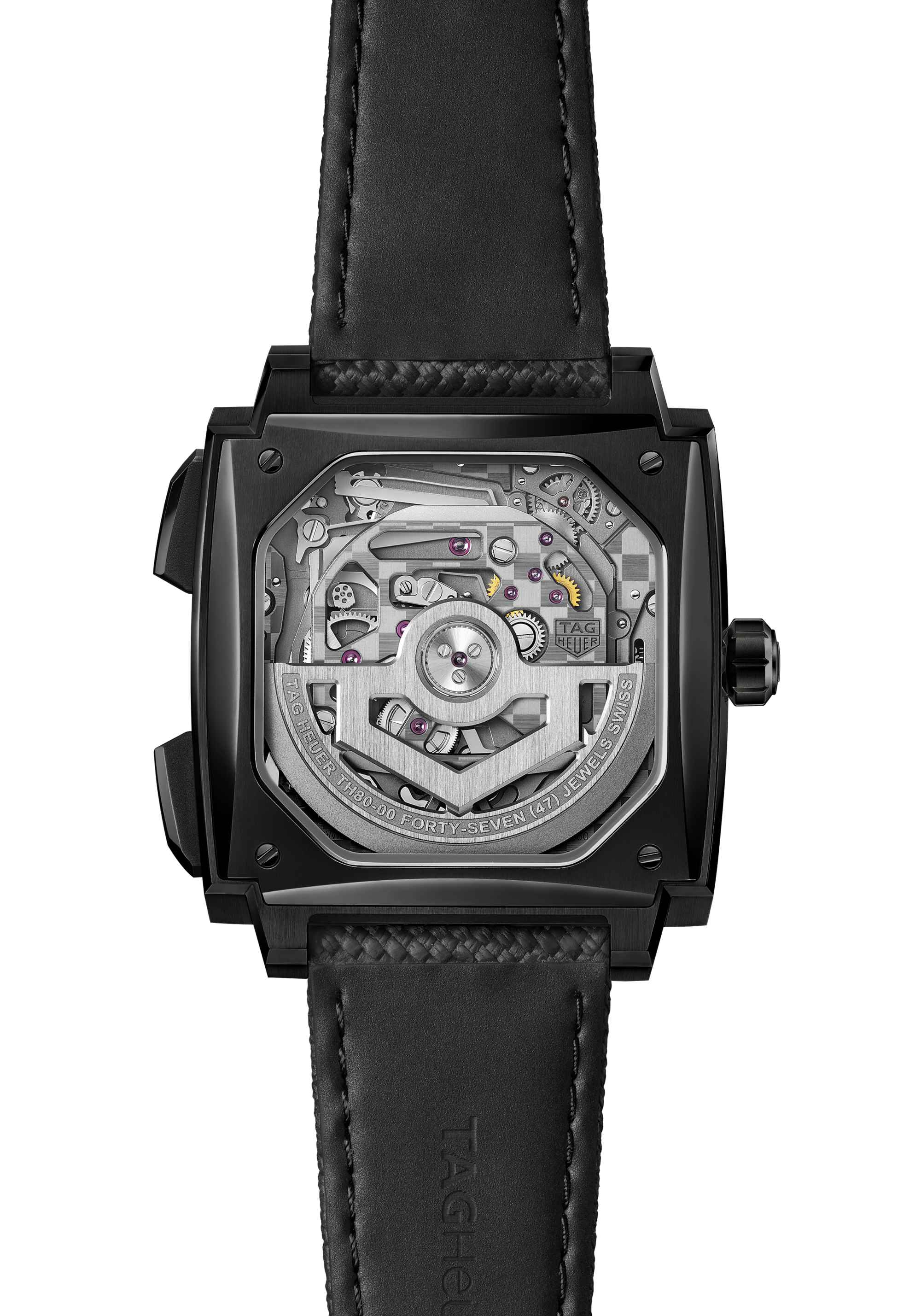 Calibre TH80-00機芯具有TAG Heuer 泰格豪雅的TH-Carbonspring擺陀,以5赫茲振頻運行,精準超卓。機芯經COSC認證並具備70小時動力儲存,透過方形藍寶石水晶玻璃錶背盡顯運行美態,而錶橋上則飾有品牌標誌性的方格旗圖案。