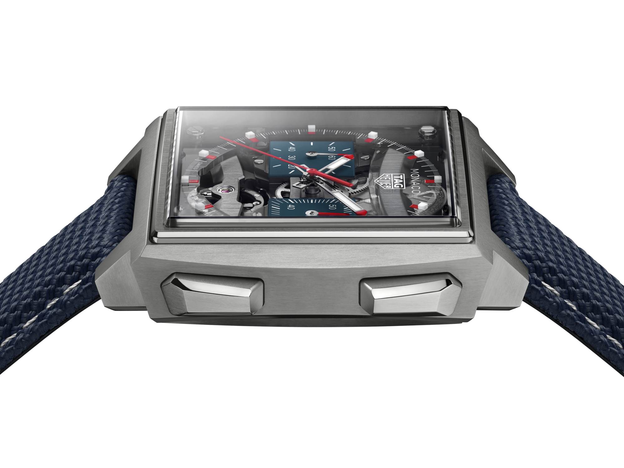 40毫米錶殼以鈦金屬打造,柔韌輕盈。藍寶石水晶玻璃錶背展現方形機芯的精巧結構,而襯以織物壓印和灰色縫線的藍色橡膠錶帶兼具舒適優雅。這款TAG Heuer Monaco(摩納哥)腕錶體現品牌的前衛精神——創新、獨一無二、為耐用而生。