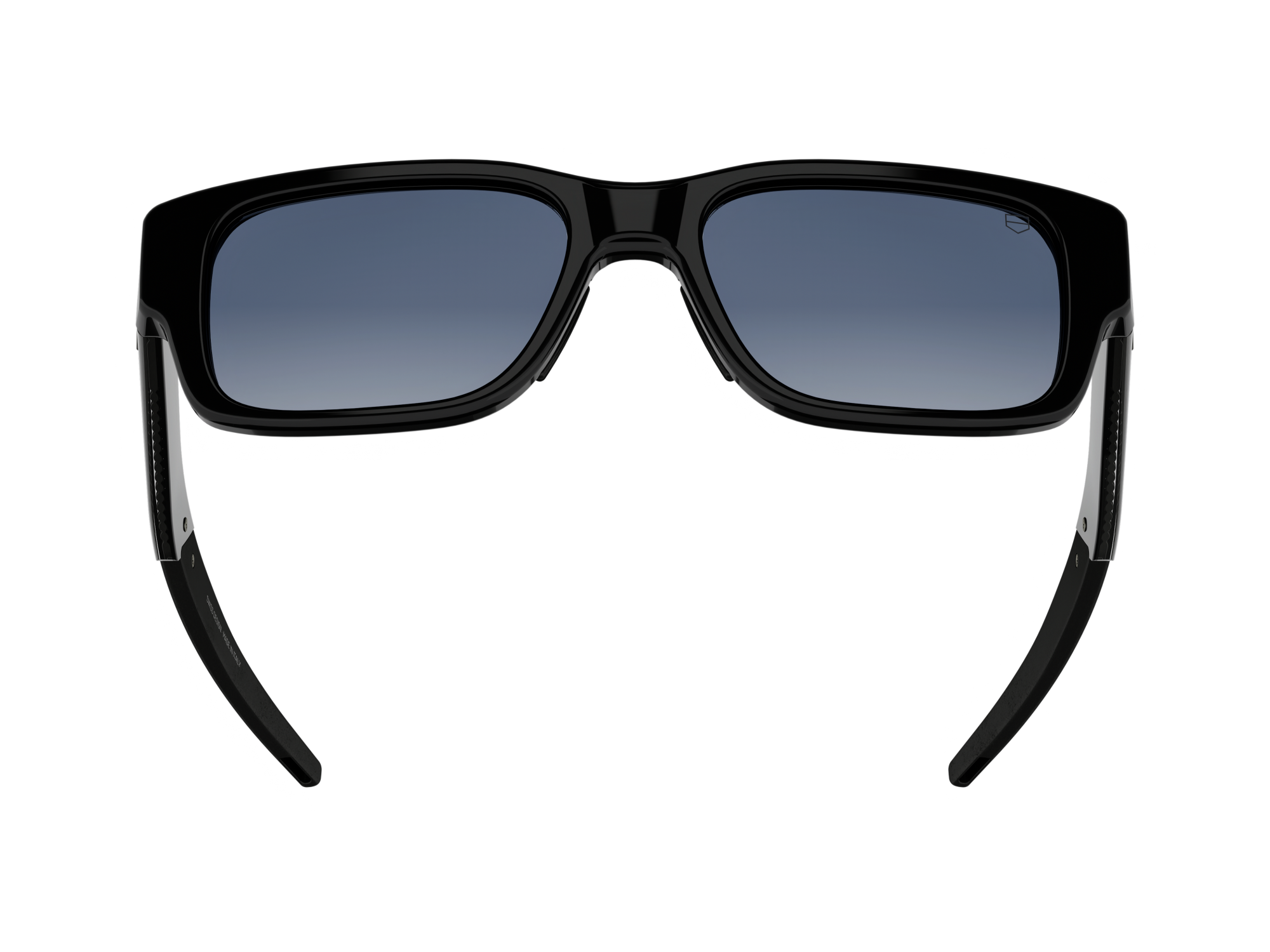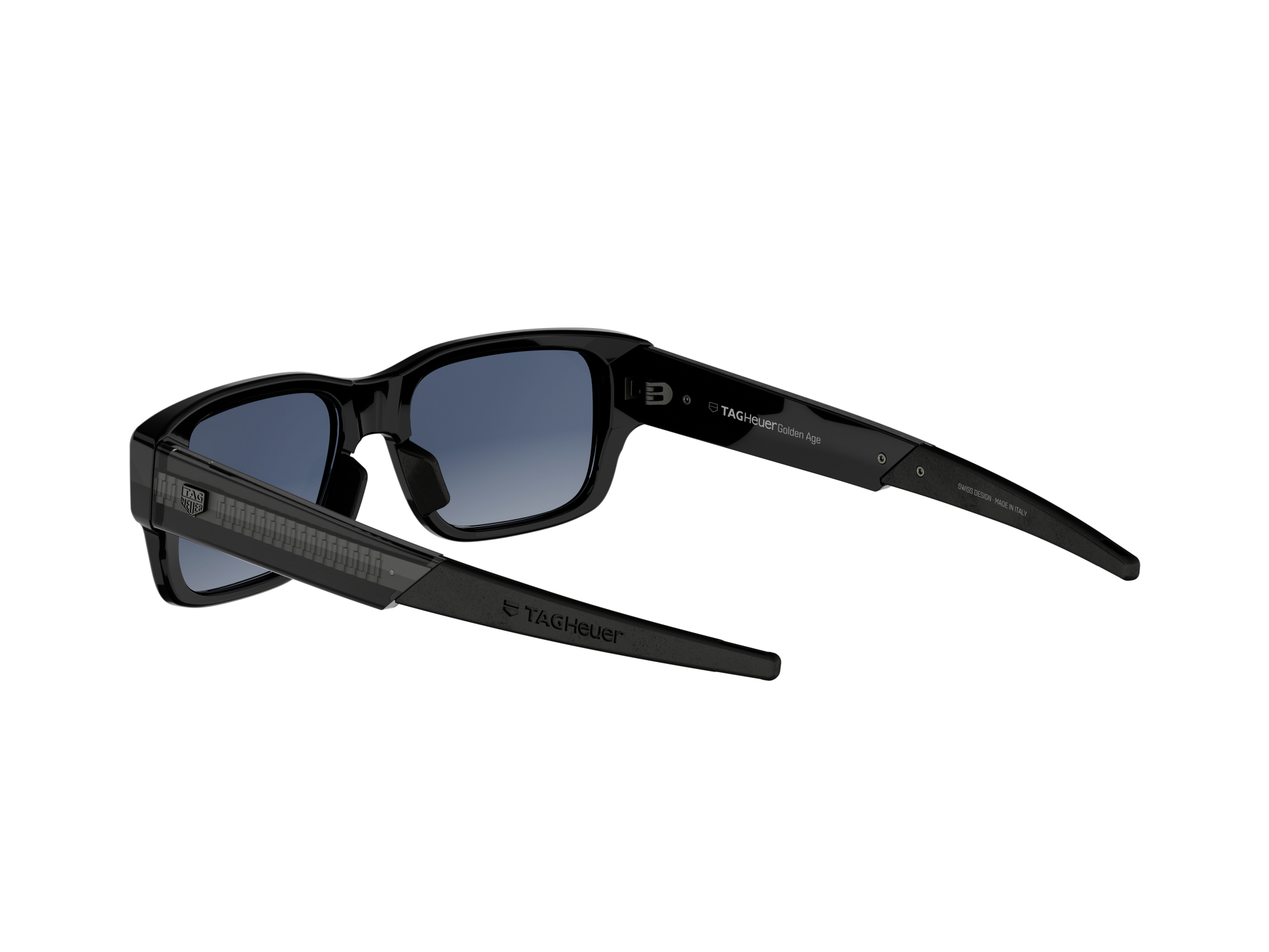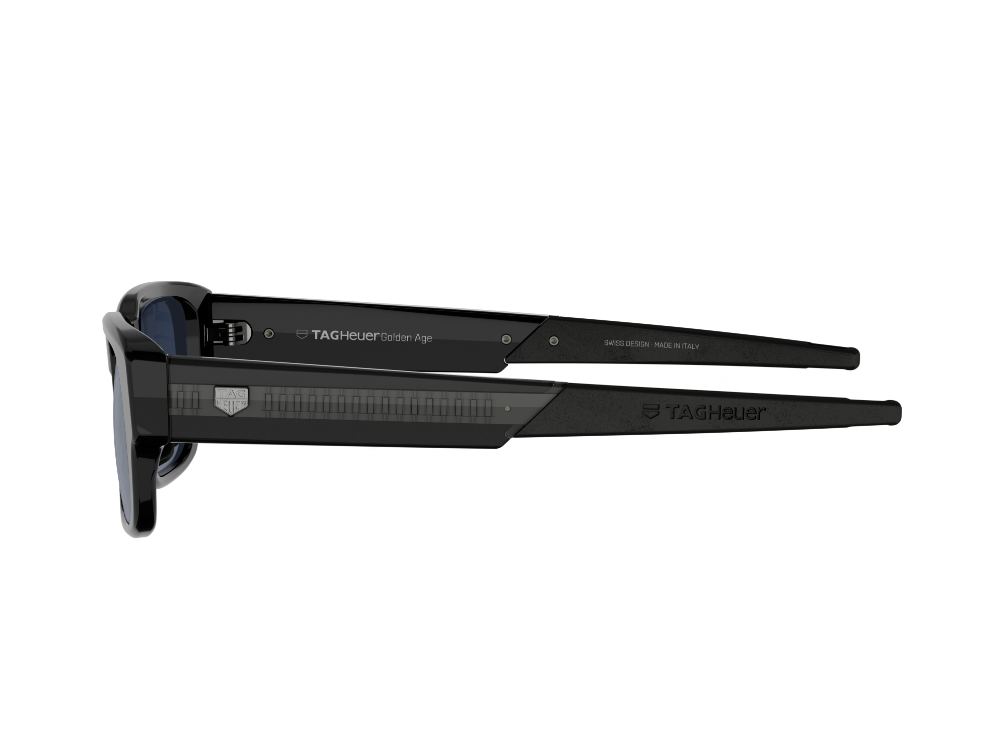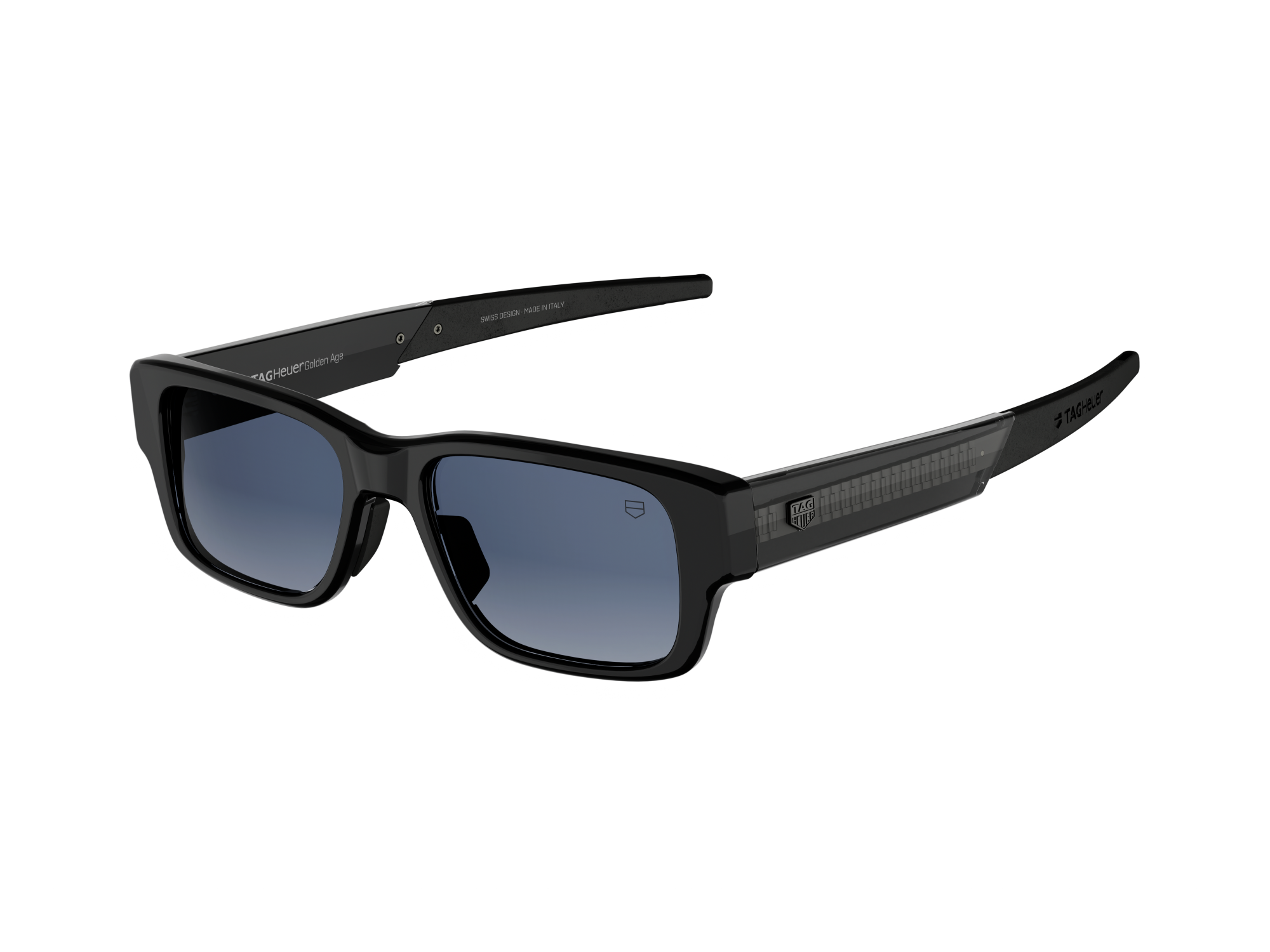 This pair of TAG Heuer Golden Age sunglasses features a rimmed acetate frame designed for everyday comfort and durability. The shiny black front face pairs with black and crystal acetate temples reveals a metal insert inspired by the iconic H-links bracelet of TAG Heuer timepieces. Interchangeable rubberised bio-nylon nose pads and straight temples with adjustable endtips improve adaptability and ensure a precise, personalised fit. Gradient blue bio-nylon lenses with Base 4 curvature offer natural vision and glare reduction. Category 3 lenses include anti-reflective and anti-dirt coatings and remain RX-compatible.