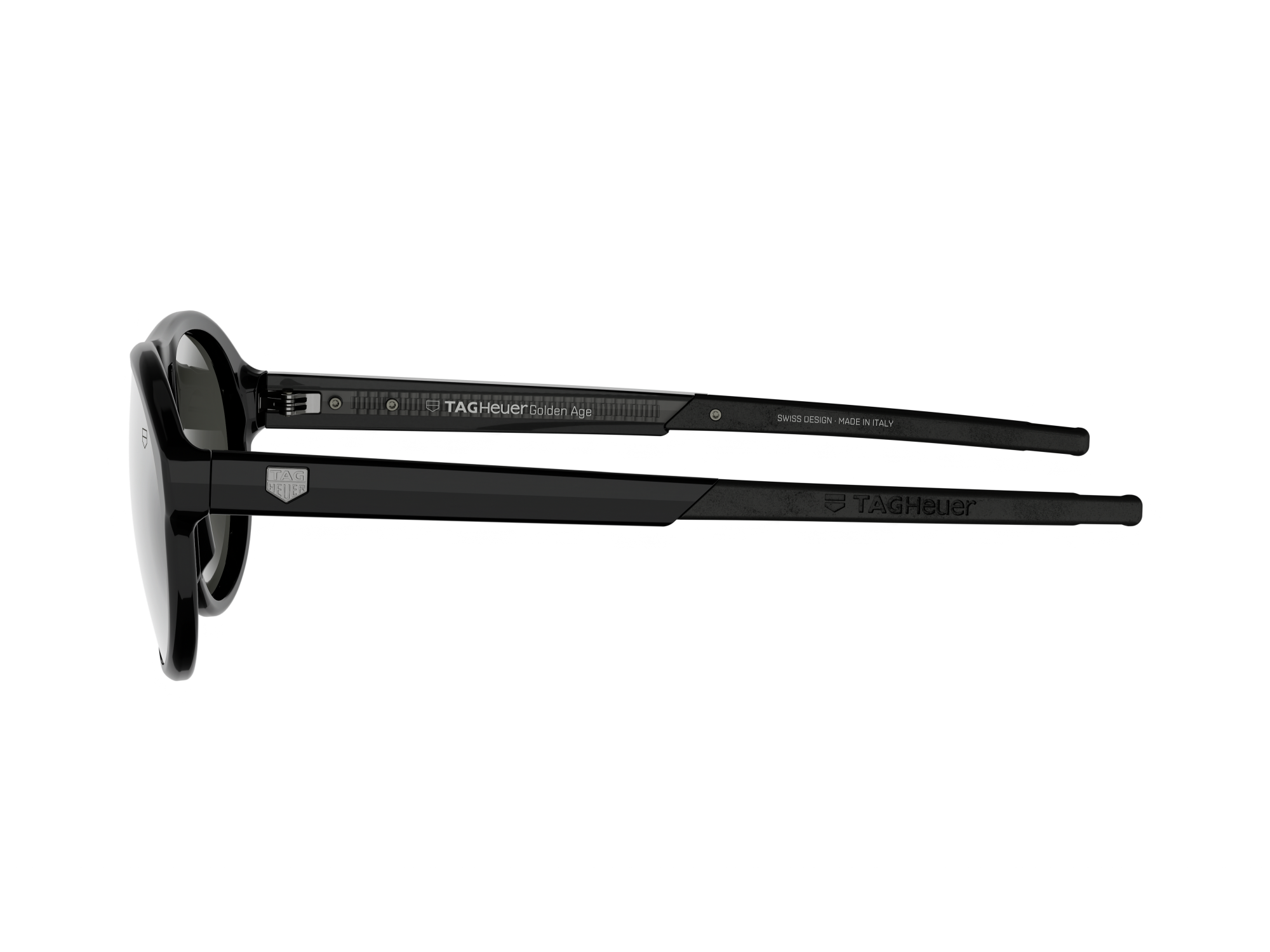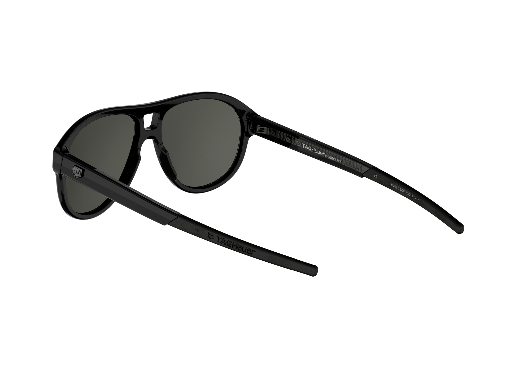 The TAG Heuer Golden Age sunglasses combine a robust acetate frame with high-quality sun lenses designed for everyday wear. The rimmed front face in shiny black acetate creates a clean, timeless profile, complemented by acetate temples with rubber endtips for enhanced grip. Solid smoke bio-nylon lenses with Base 4 curvature ensure natural visual comfort and glare reduction. Category 3 lenses feature anti-reflective and anti-dirt coatings and are RX-compatible.
