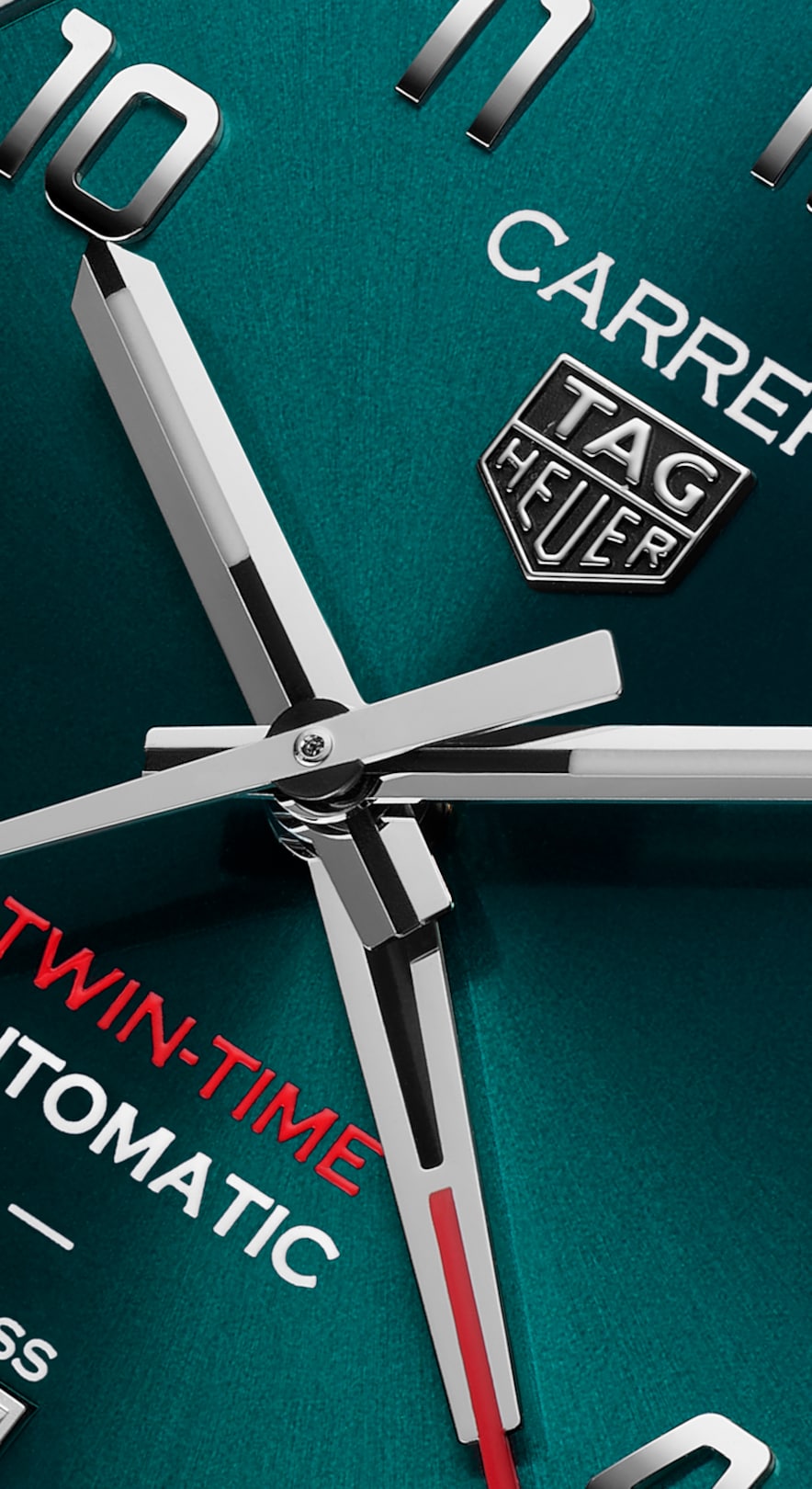 The sunray-brushed teal green dial creates a striking, instantly recognizable look. The rhodium-plated GMT hand with a red lacquered tip and the "railroad" interior minuterie evoke classic elegance and timeless design. The caseback proudly displays an engraved Victory Wreath, symbolizing the TAG Heuer Carrera’s ‘token of luck’ legacy.