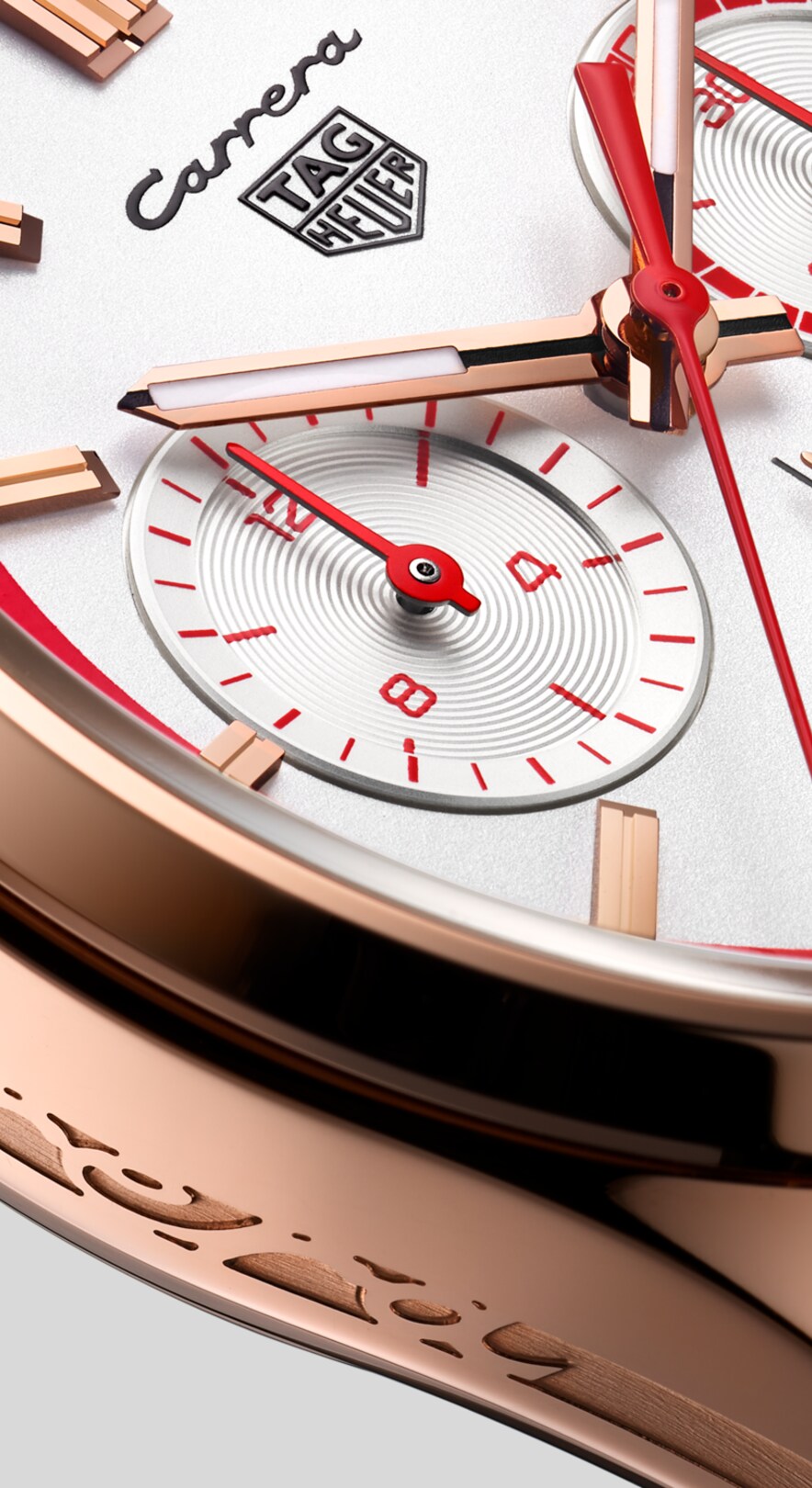 Drive to surpass with a striking livery in red and white, perfectly accented by the bold Carrera branding on the dial, case profile and strap.