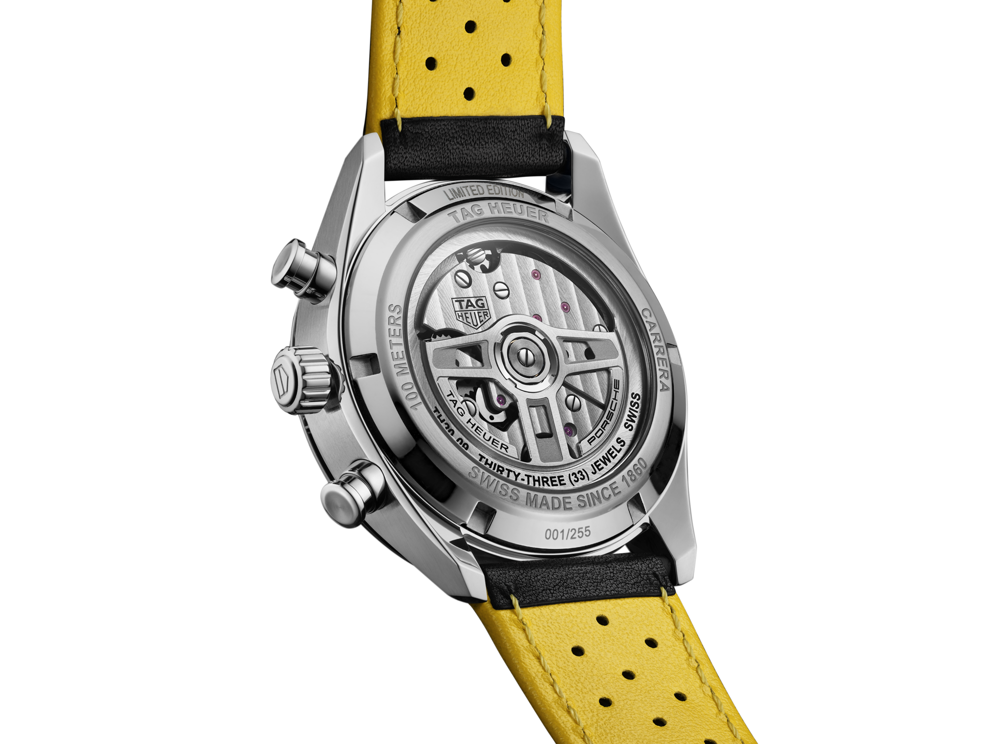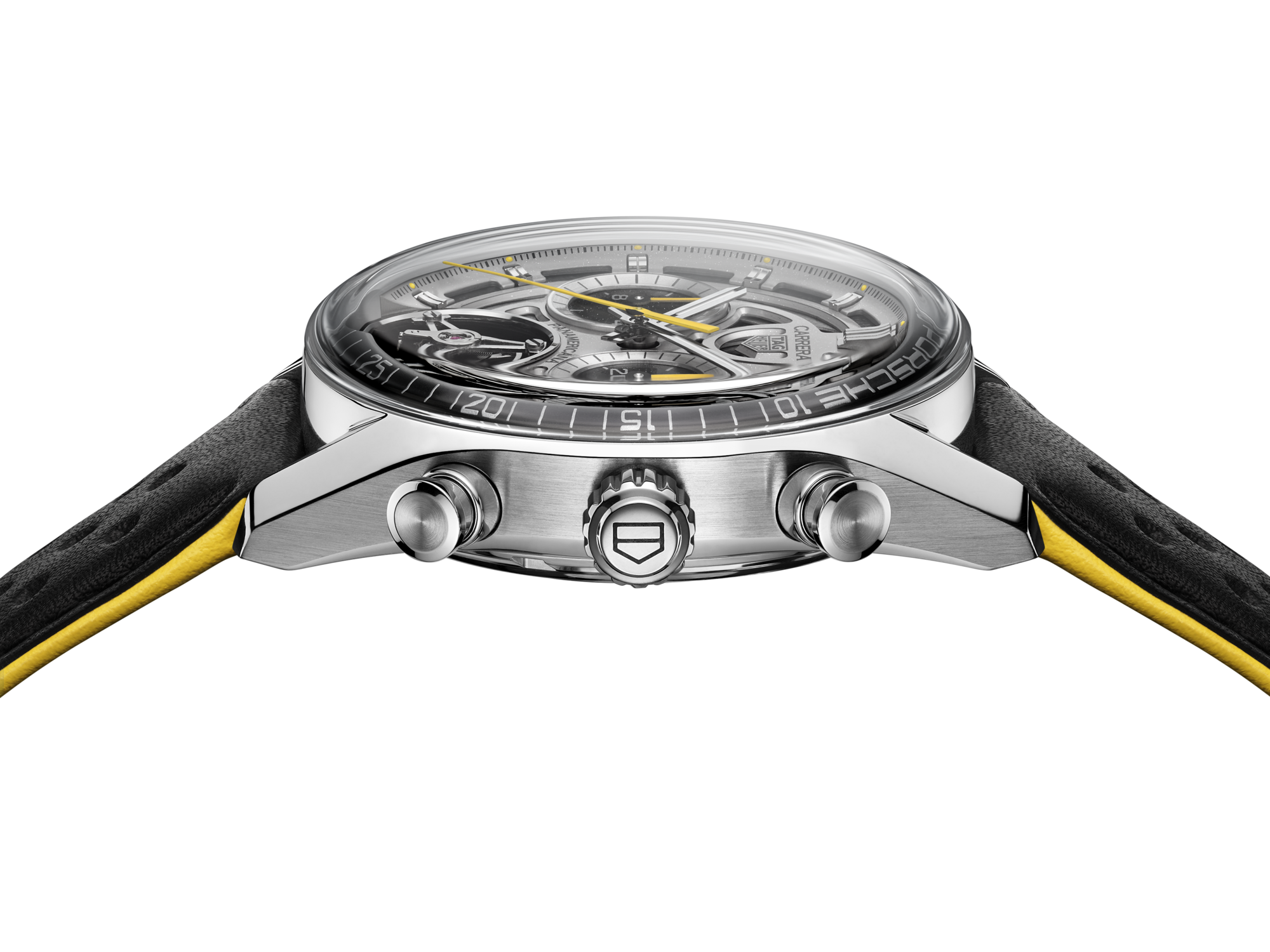 The silver skeleton dial, inspired by the rims of the Porsche 550 Spyder, features subtle yellow accents, echoing the iconic car and infusing the watch with a sense of speed.