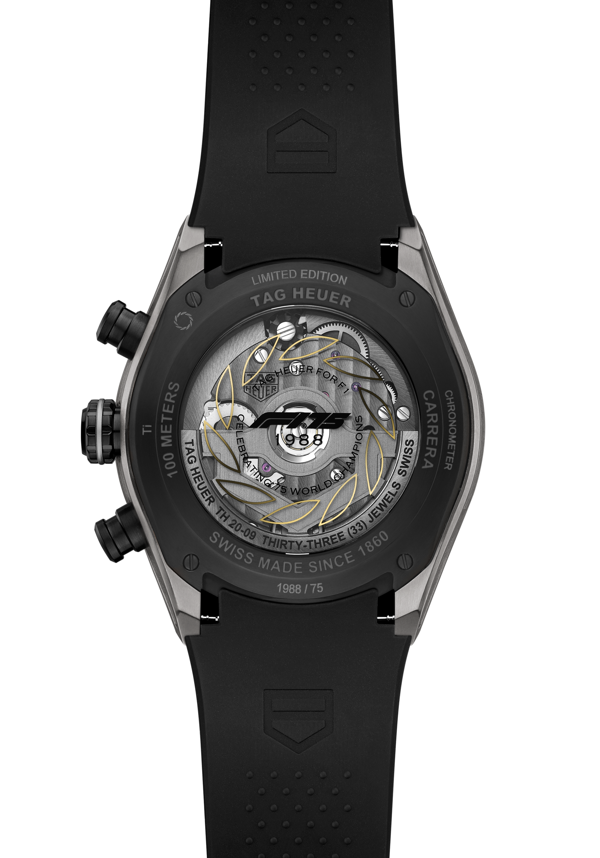 This timepiece celebrates F1®’s legacy by honoring its champions with a unique caseback engraving: each of the 75 limited-edition watches features a different year of championship glory engraved on the sapphire crystal encircled by a golden Victory Wreath – a timeless symbol of triumph. An individual number “YEAR/75” also appears on the caseback, further distinguishing this timepiece as a truly special creation.