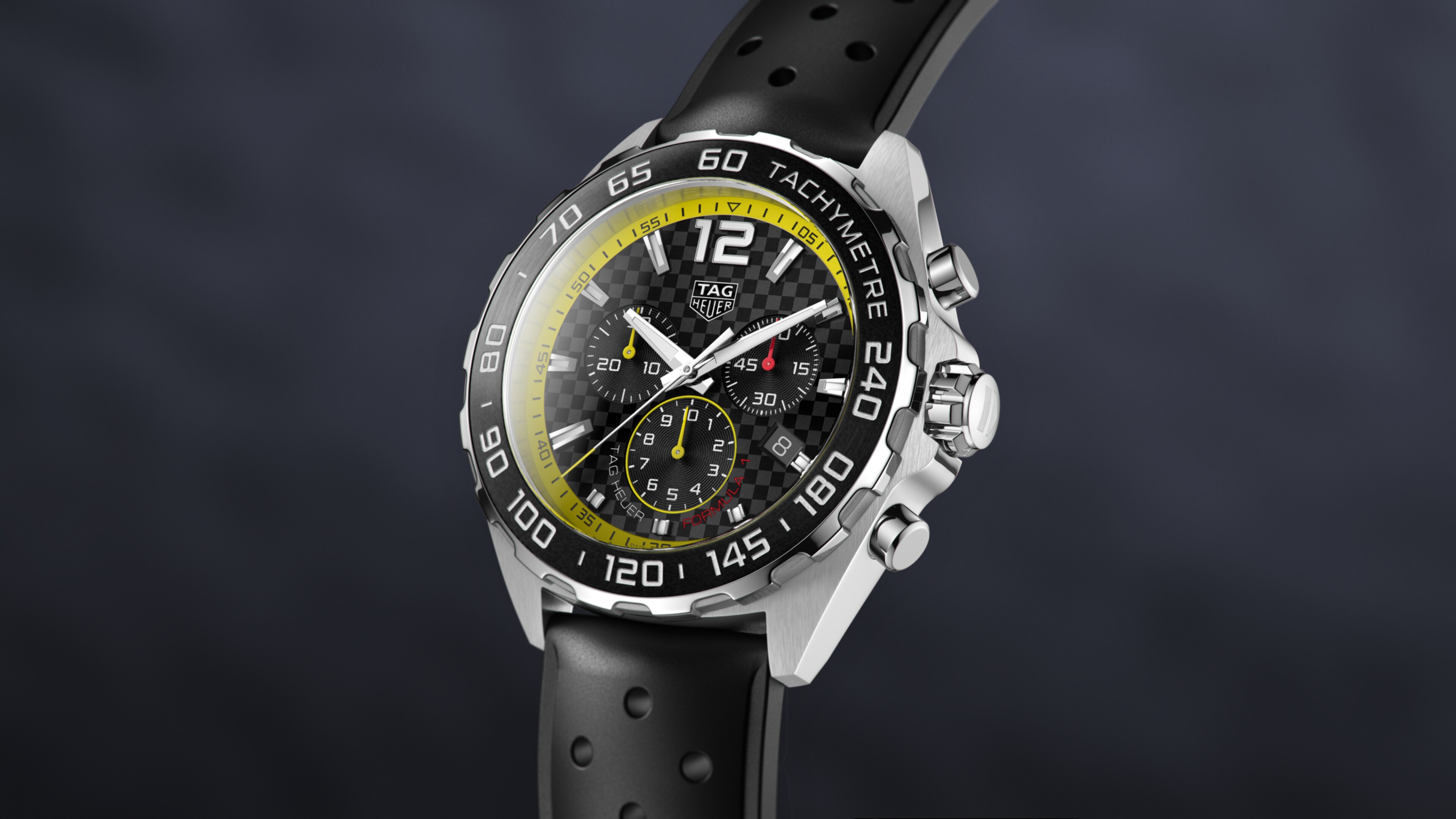 A watch that conveys the thrust and power of Formula 1 racing in its carbon fiber pattern black dial and black rubber strap with steel pin buckle.
