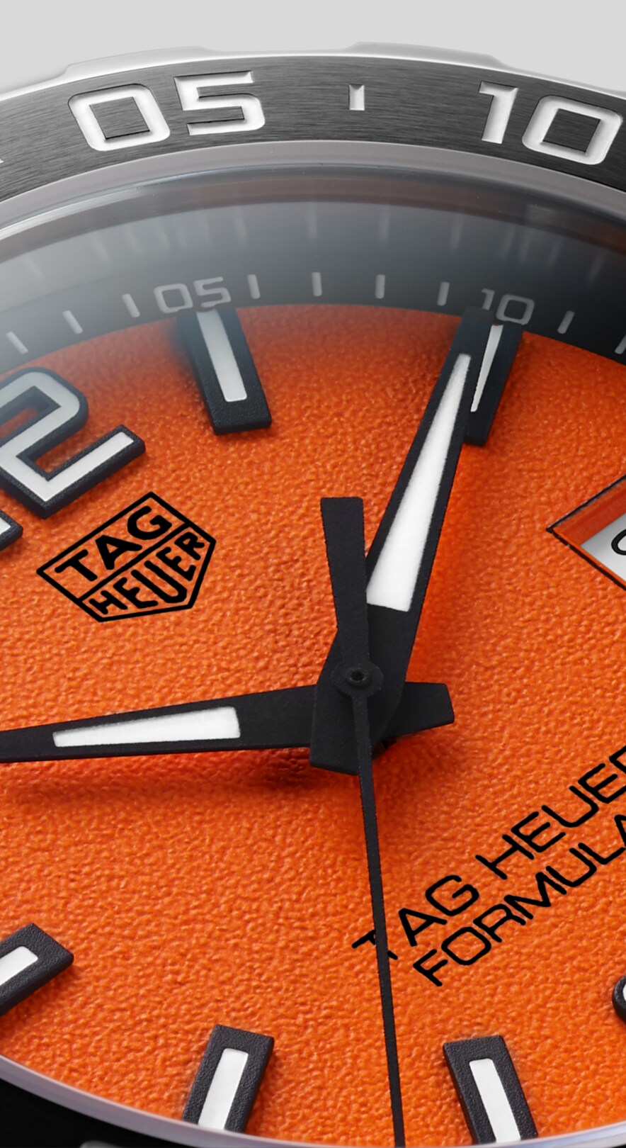 Quartz, 43 mm, Steel WAZ101A.FC8305An energetic 43mm 3 hands watch with a bold orange textured dial and white accents, matched by a black nylon strap with orange and grey touches. A tribute to the playful TAG Heuer Formula 1 models from the 80s and 90s.
