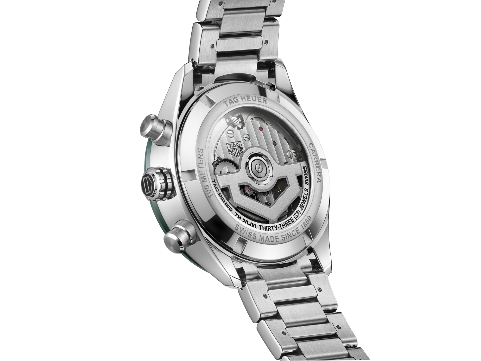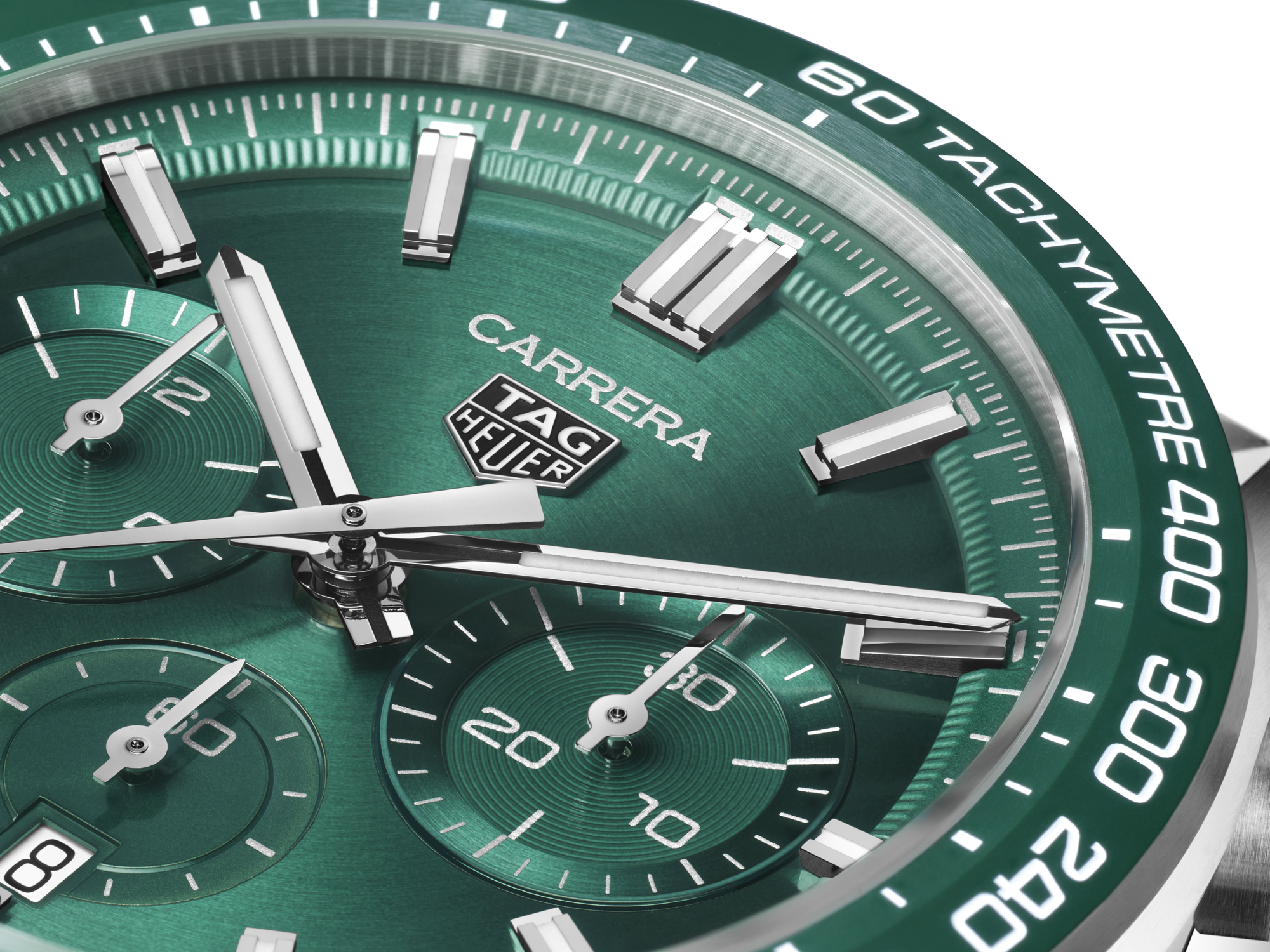 Draped in intense green, the circular brushed dial and its matching tachymeter fixed bezel make the rhodium-plated hands and indexes stand out superbly.