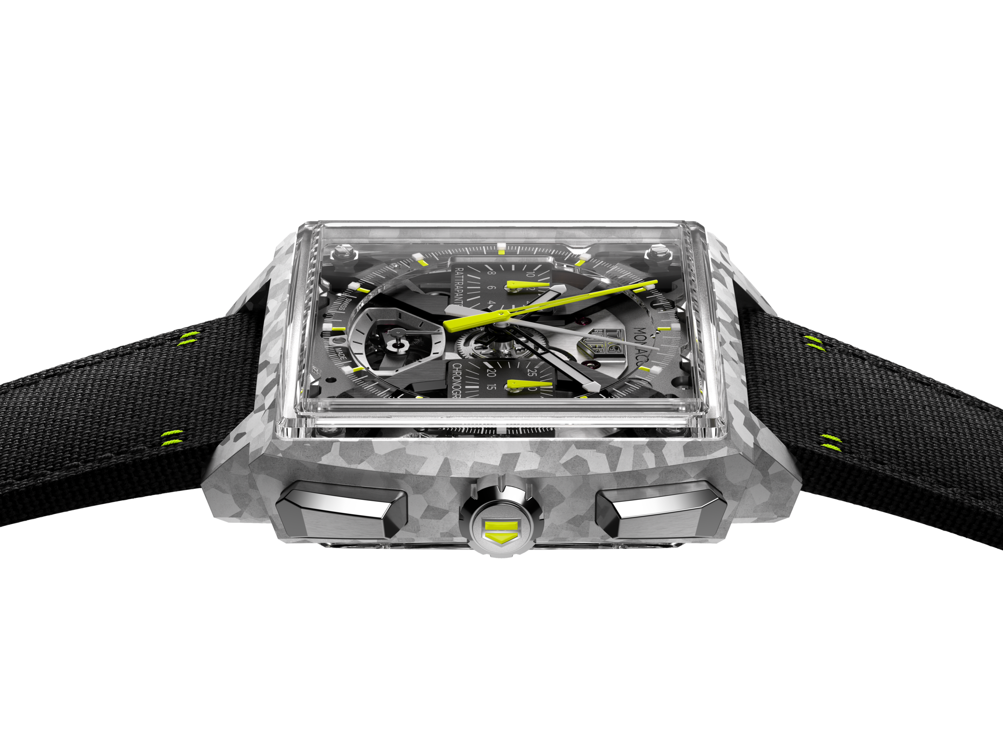 Crafted from texturized TH-Titanium developed in house by the TAG Heuer Lab, each watch boasts a distinct pattern, making every piece truly one of a kind. Weighing just 85 grams, this ultra-light yet robust timepiece also reveals the intricate Calibre TH81-00 through its sapphire dial and caseback.