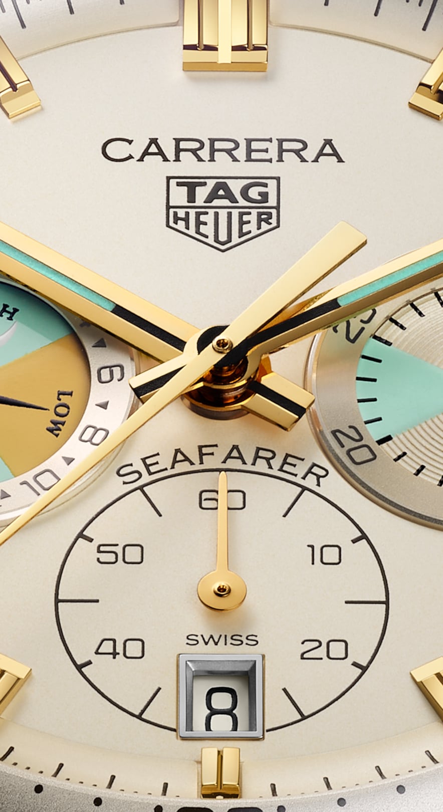 The beige opalin dial combines teal and yellow accents, inspired by a historic Heuer Seafarer model produced for Abercrombie & Fitch. At 3 o'clock, the counter's design pays tribute to regatta timing, while at 9 o'clock, the tide indicator subdial, operated by the “TIDE” push button, shows the expected time of the next high or low tide.