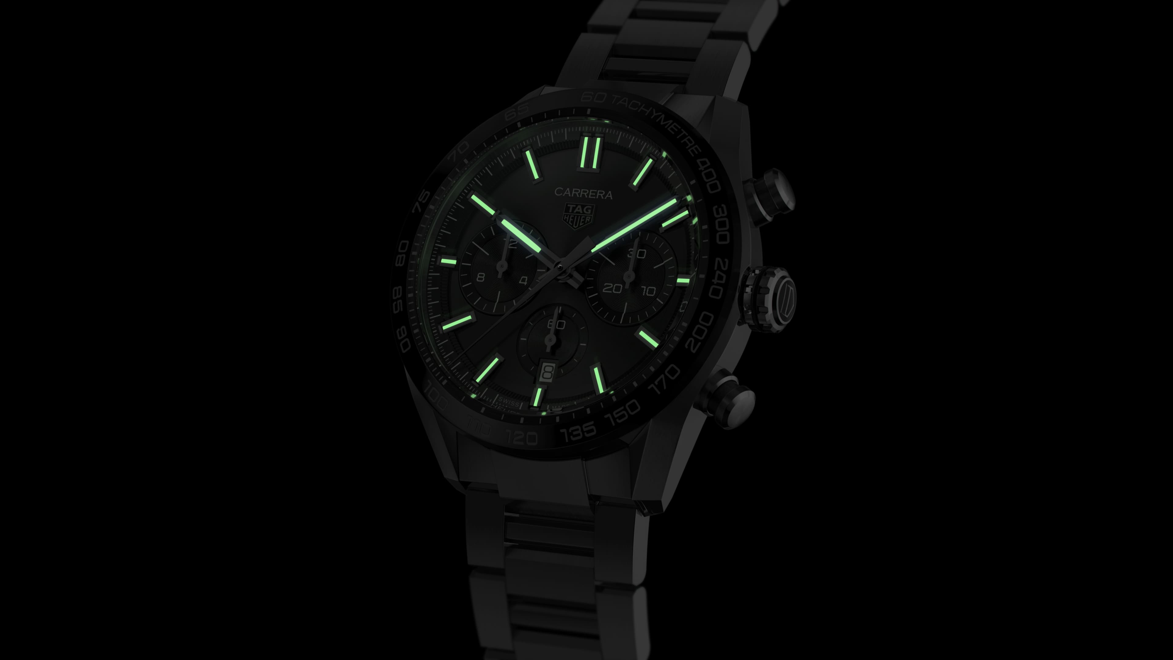 Tough ceramic black tachymeter fixed bezel and doubly anti-reflective sapphire crystal dome for telling time – and keeping it, too.