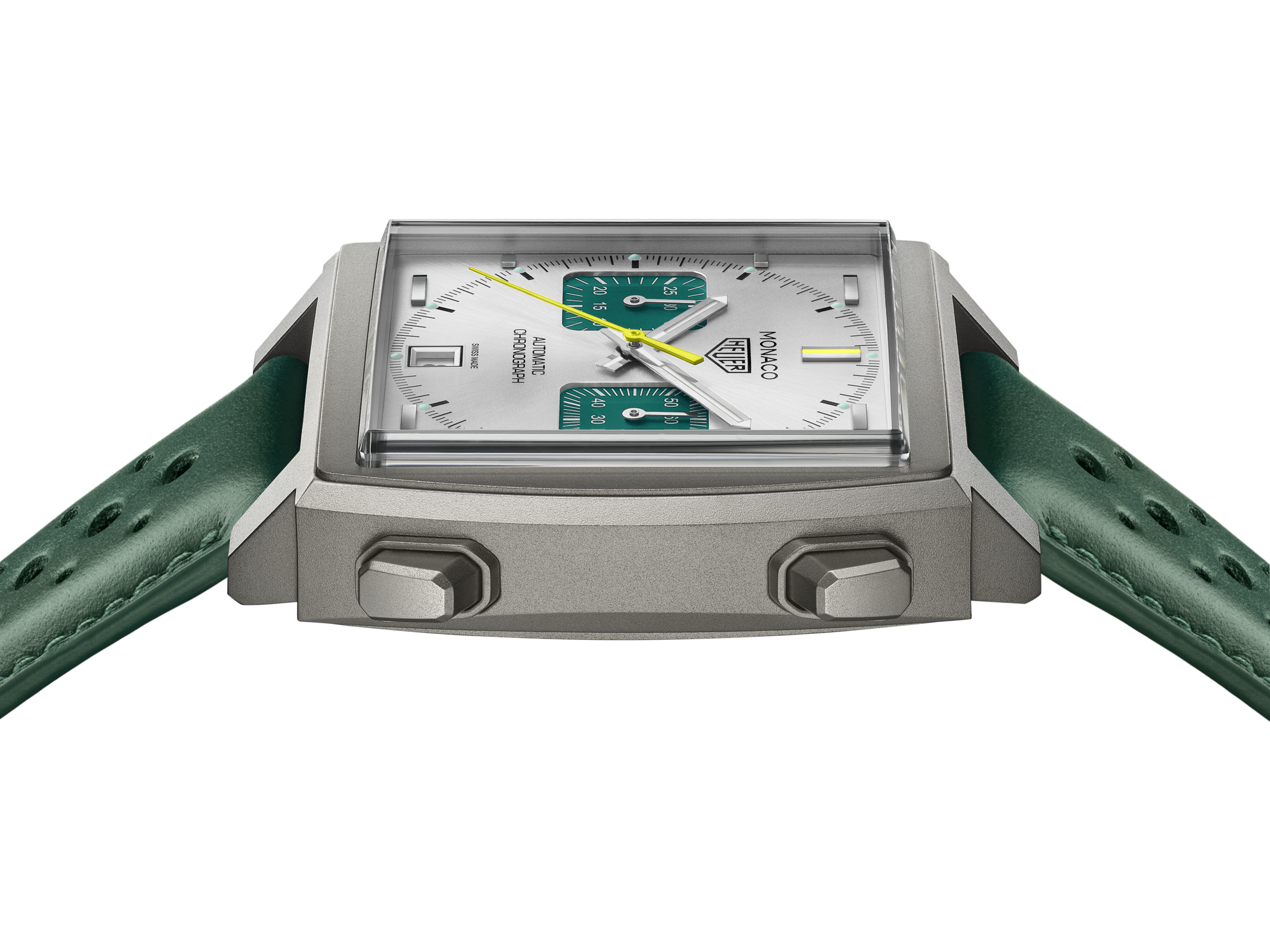 Ultra-lightweight yet tremendously robust, the 39mm titanium case comes with a green, perforated calfskin leather strap with yellow lining, adding a touch of racing flair.