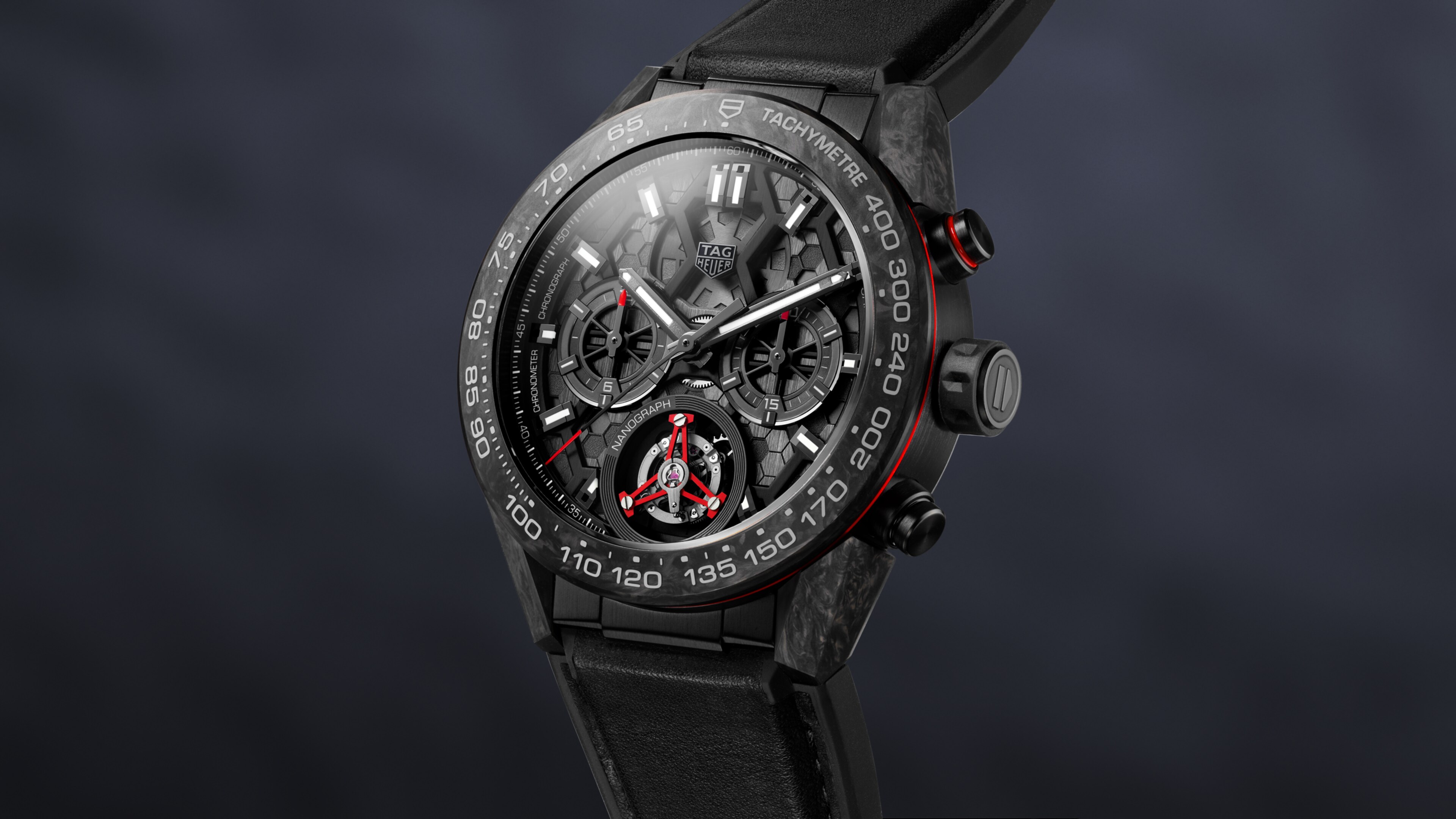 At the heart of the watch: the Calibre HeuerO2T COSC Nanograph, with its red-accented tourbillon made using an accurate carbon composite hairspring.