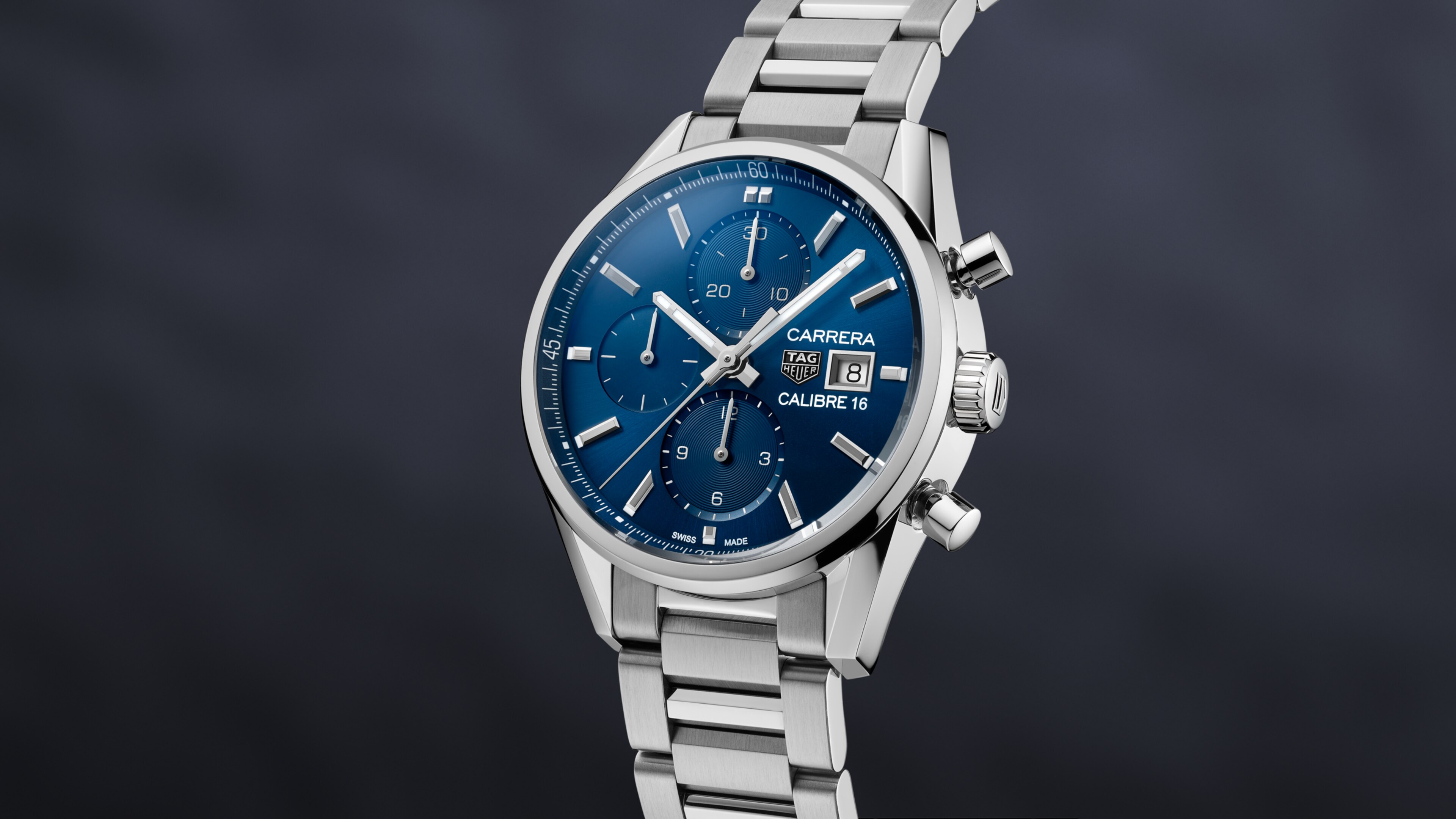A contemporary classic. One of the bestselling chronographs in the Carrera collection, with blue sunray brushed dial, striking blue sub-dials and 3-row bracelet in rhodium-plated steel.