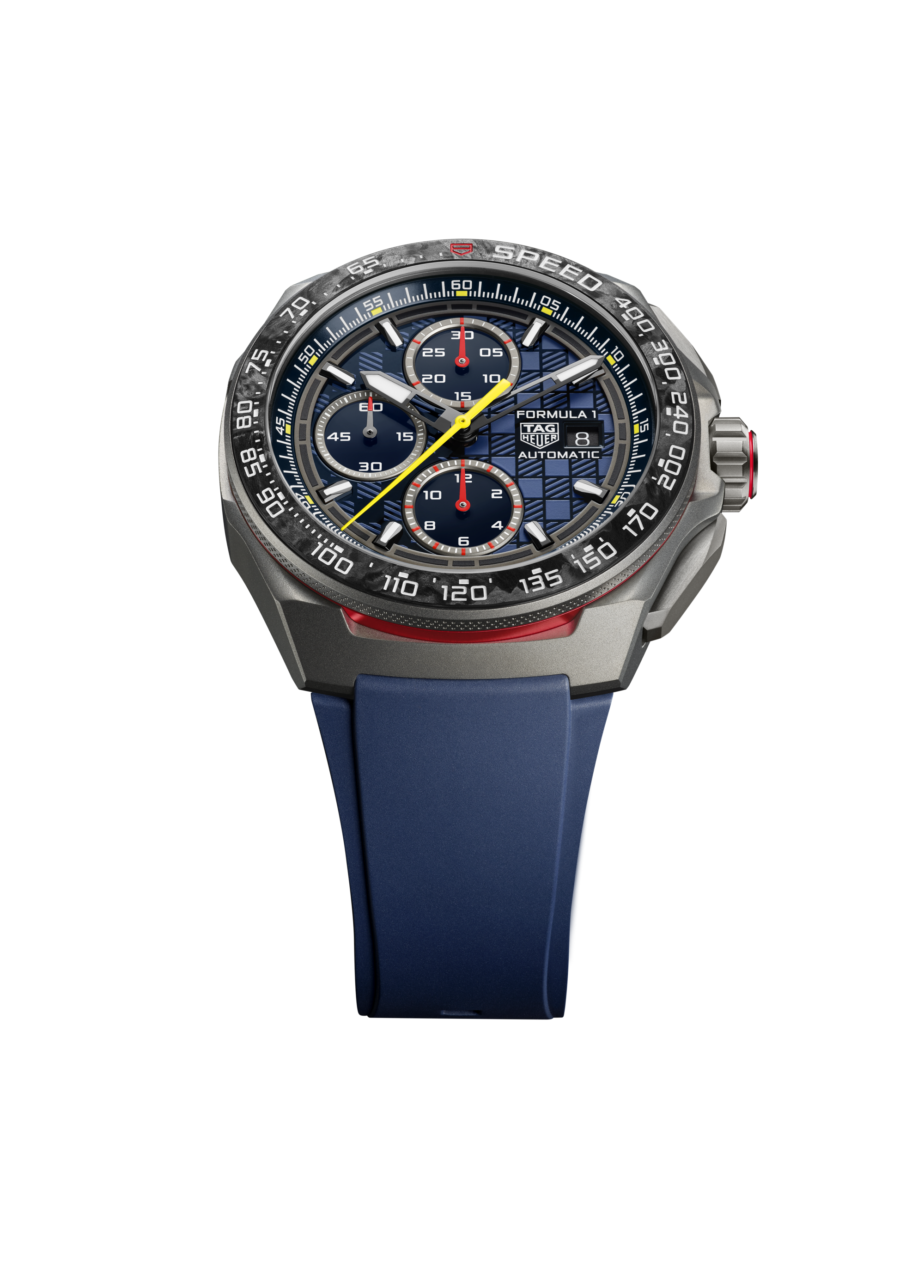 With its blue opalin dial with checkered patterns and red accents combined with vibrant yellow highlights on the chronograph hands and counters, this sporty watch mirrors the high-octane energy of the racetrack.