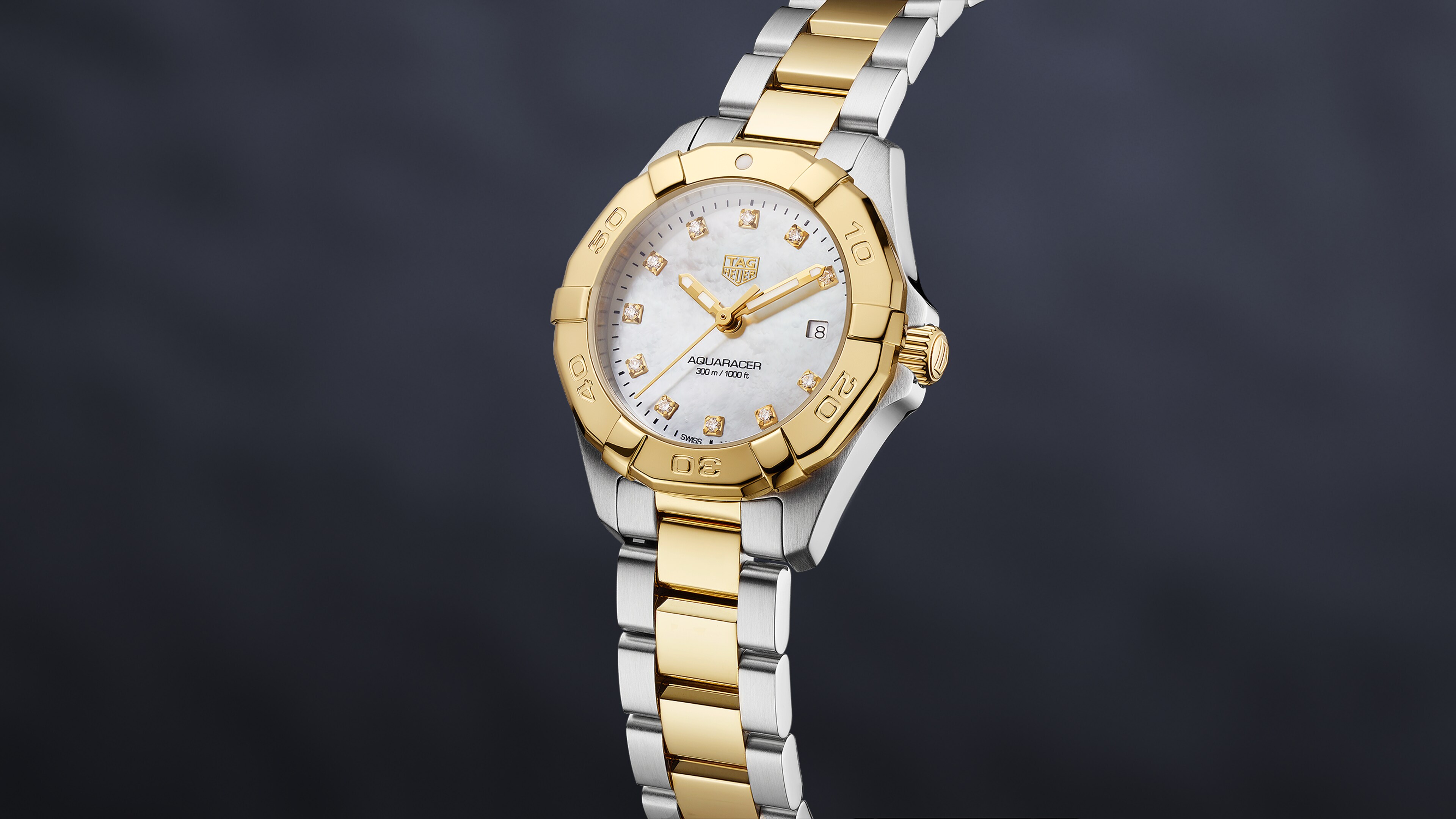 Quartz, 27 mm, Steel WBD1422.BB0321True to the TAG Heuer Aquaracer's iconic design aesthetics, yet stunningly endowed with a steel bezel plated with 18K 2N yellow gold, diamonds and a two-tone steel bracelet with links plated in 18K 2N yellow gold. The petite diameter (27mm), gentler case profile and finely worked dial details create superb appeal.