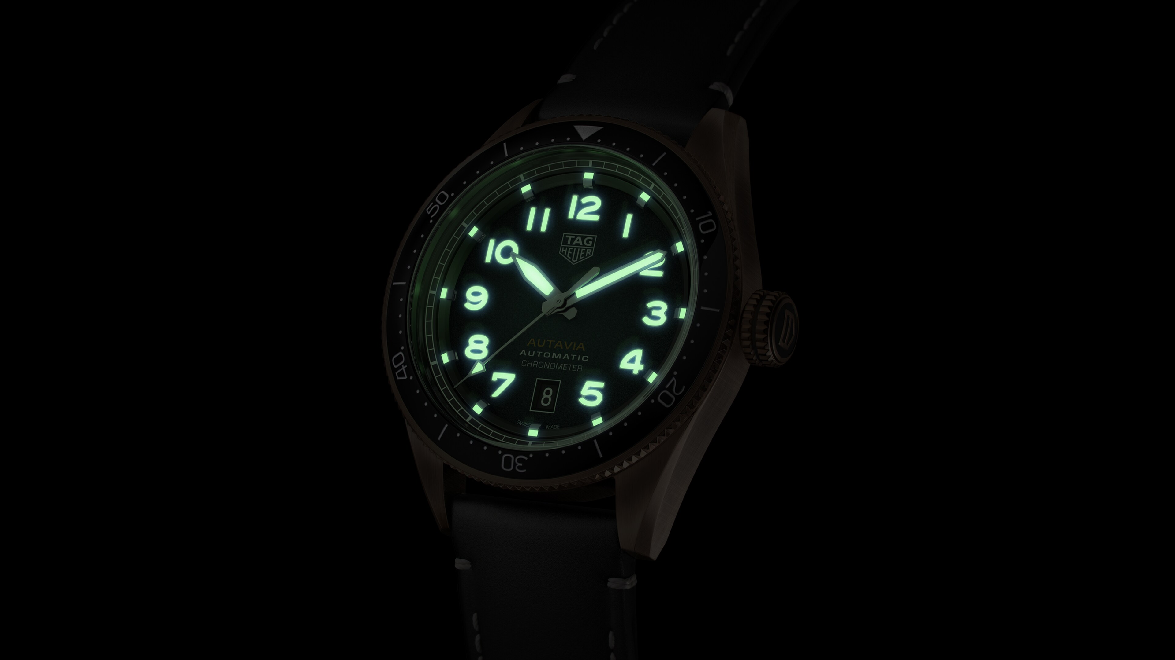 The sparse dial design is highlighted by numerals and hands with ivory Super-LumiNova treatment for enhanced readability in low light. The easy-to-read date window is at 6 o’clock.