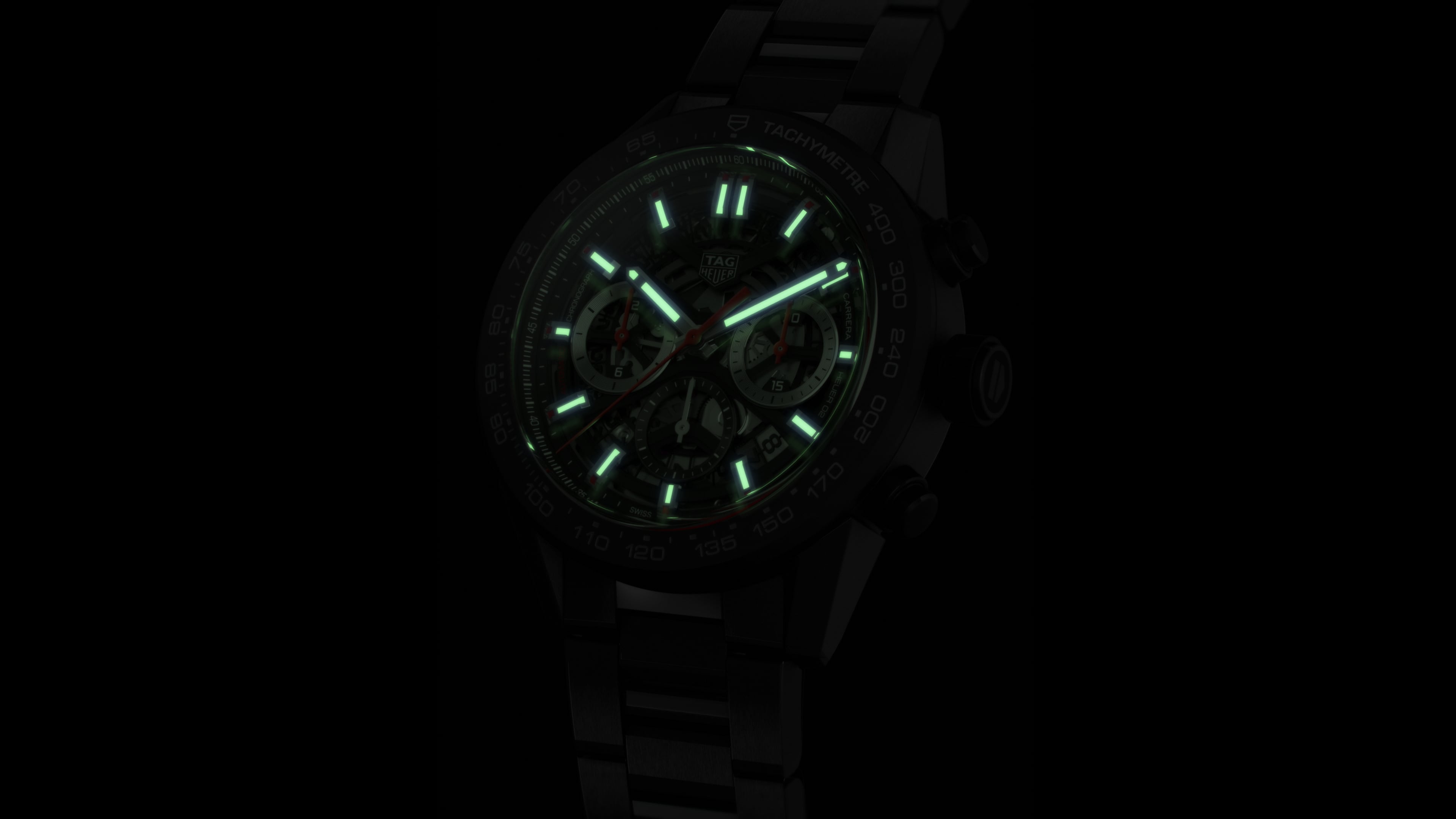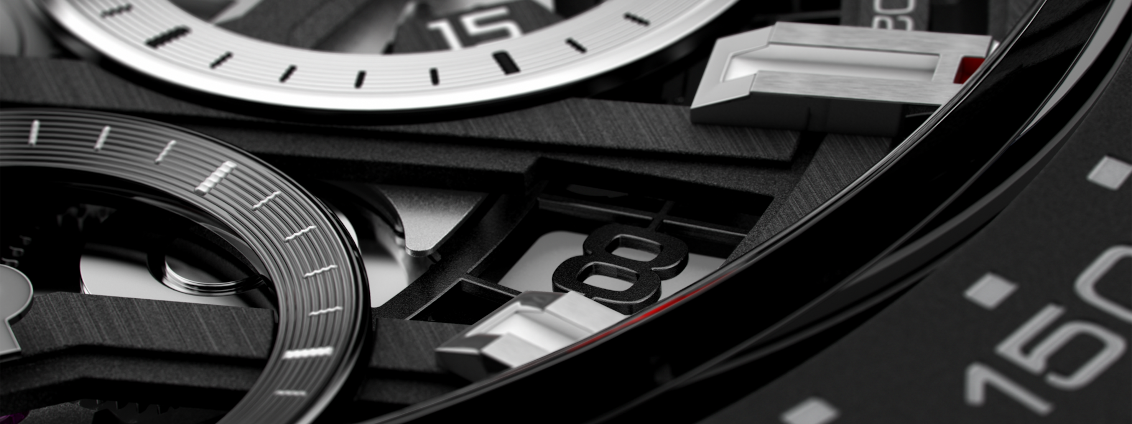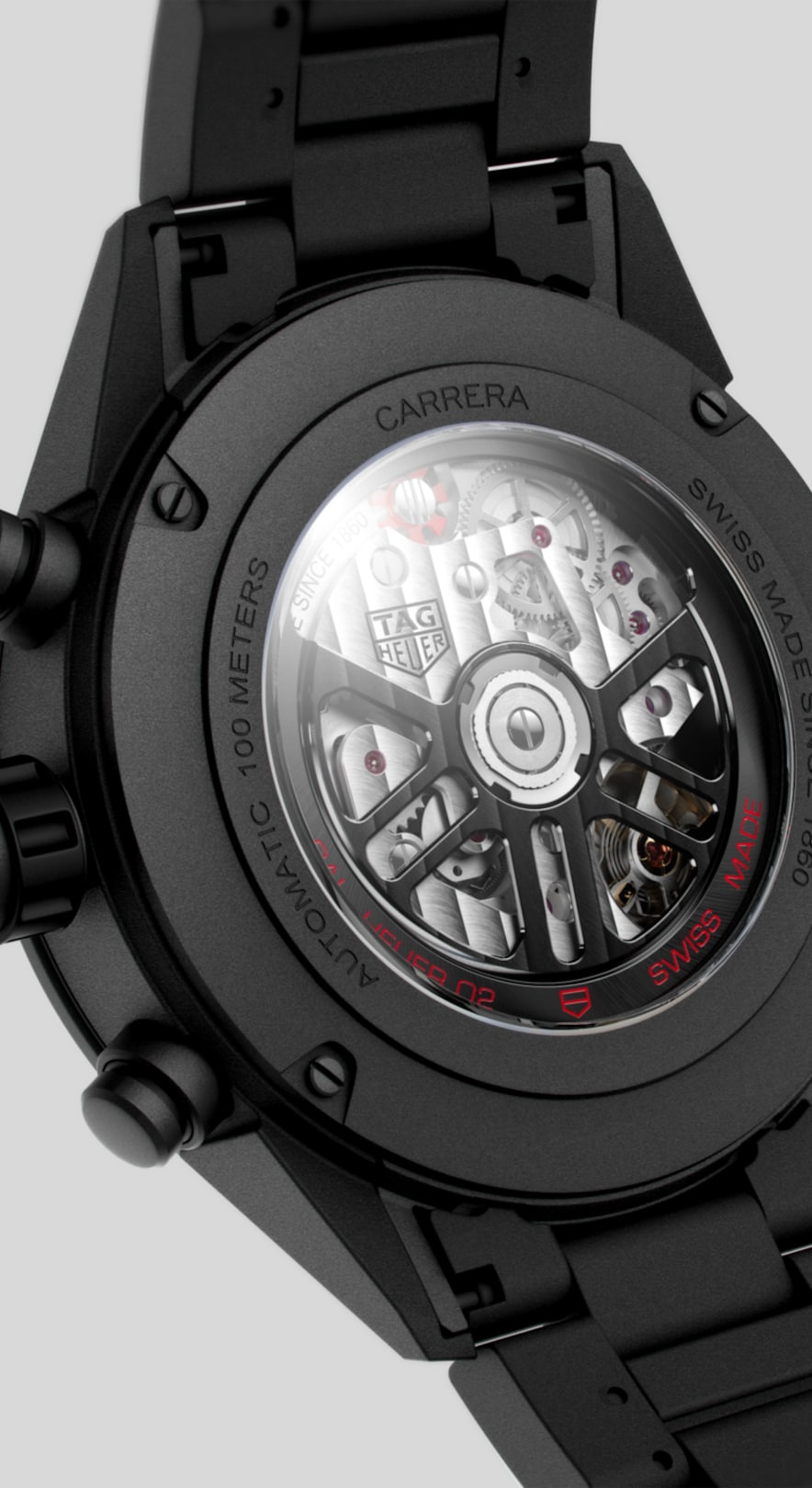 Leading-edge materials from automobile industrie are used throughout the design. Open-working reveals the inner workings of the 100% in-house manufactured movement, the Heuer 02, with a stunning 80 hours power reserve.