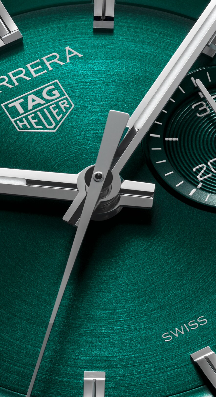 The teal green circular-brushed dial boasts a single minute chronograph counter at 3 o'clock and an angled date window at 9 o'clock, offering a pure and ultra-legible display.