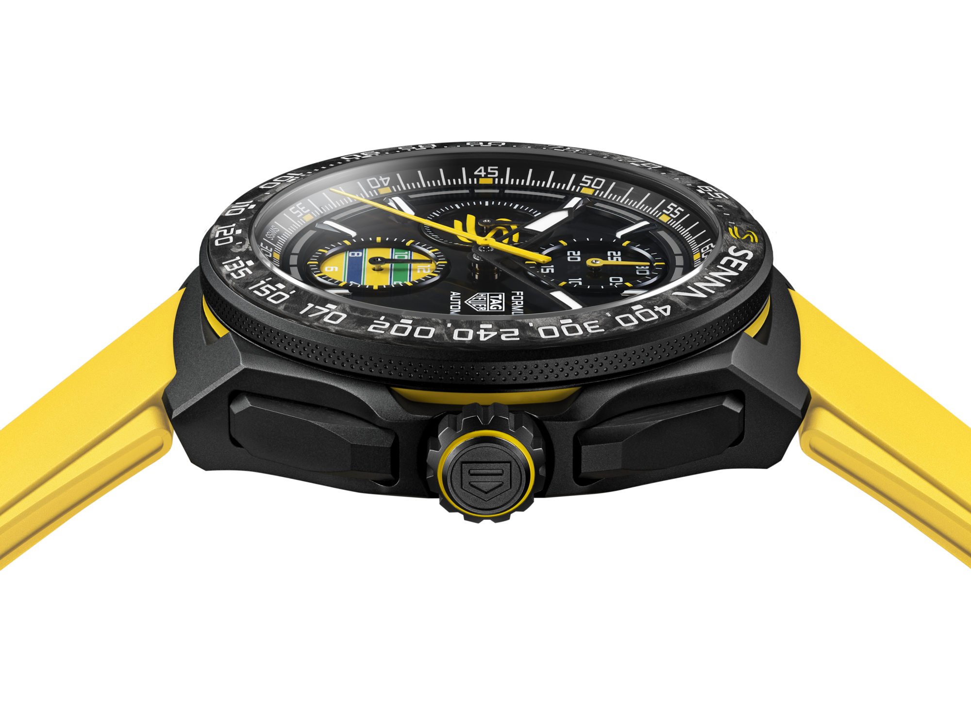 TAG Heuer pays tribute to one of its most iconic partnerships with the TAG Heuer Formula 1 Chronograph x Senna. This bold timepiece captures Ayrton Senna's daring, fearless, and relentless pursuit of excellence, spirit and passion for racing through a unique design and the use of high-end materials, such as the titanium case coated with black DLC and the forged carbon bezel.