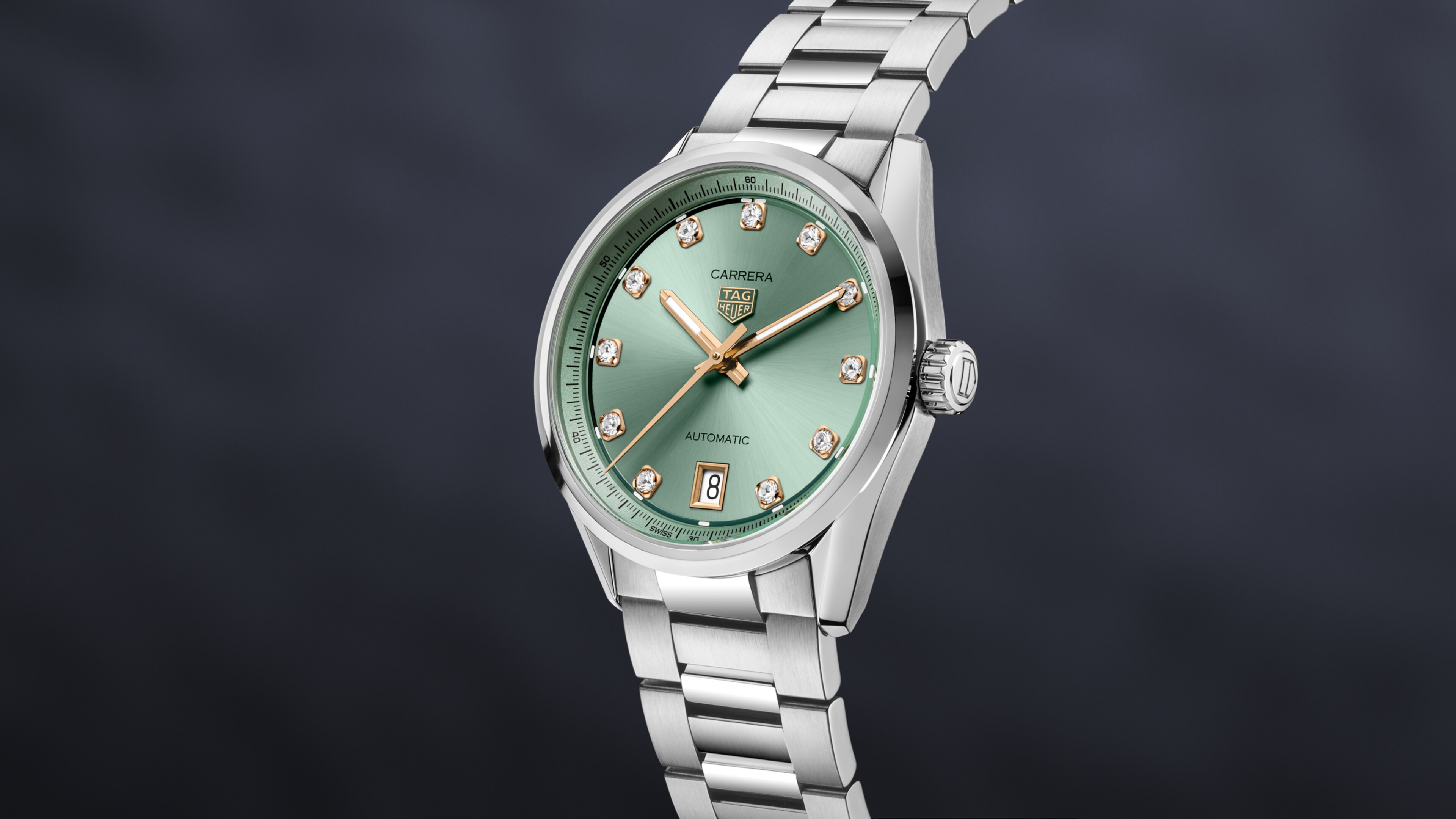 Automatic, 36 mm, Steel WBN2317.BA0001Introducing the TAG Heuer Carrera Date, presented in a 36mm steel case with a green sunray-brushed dial. This watch redefines modern sophistication. The dial, in a subdued pastel-like green, is set with 11 VS diamonds totaling 0.22 ct that bring a subtle sparkle, complemented by rose gold-plated accents for a refined look.