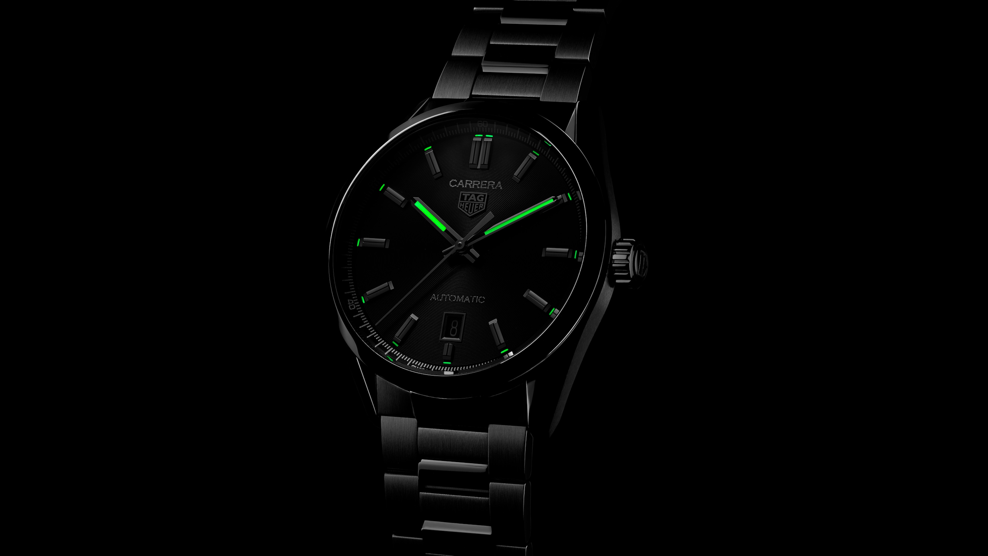 The black azurage dial brings out the luminescent rhodium-plated hands, markers, and the applied TAG Heuer logo.