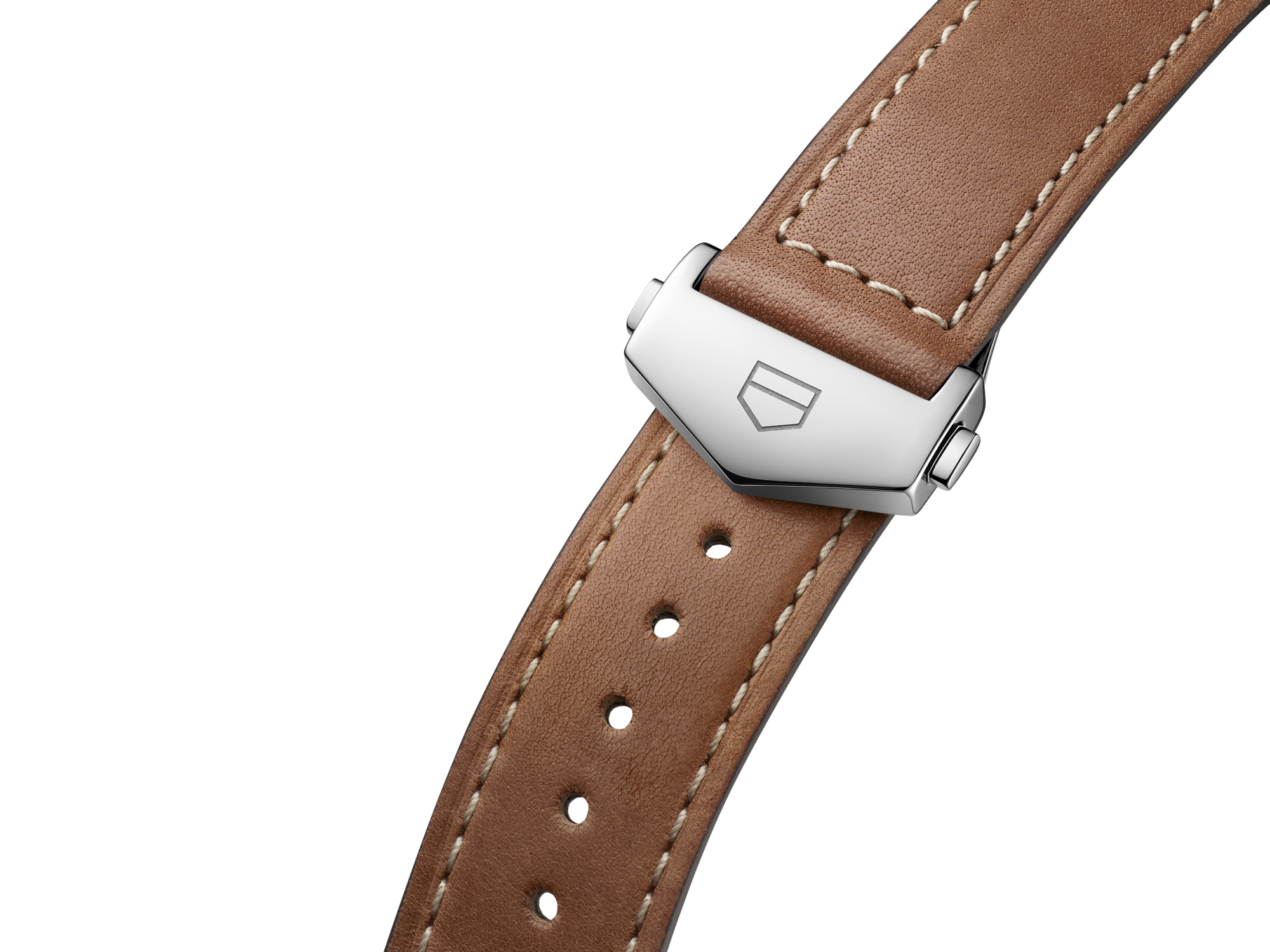 Enhance your TAG Heuer Carrera 36mm with this luxurious golden brown, smooth calfskin leather strap. The strap's refined appearance, highlighted by its dark brown lining and contrasting ecru white stitching, blends traditional style and contemporary flair. It's completed with a durable stainless steel deployant buckle.