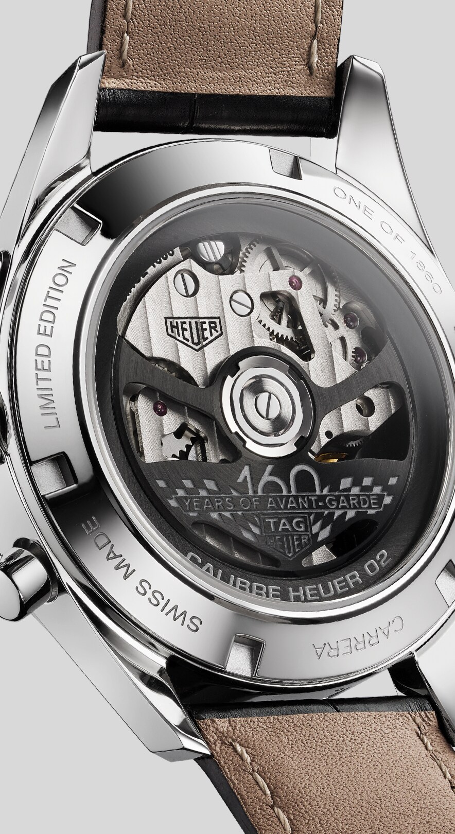Cinturino in alligatore nero, limitato a 1860 esemplari – anno di fondazione di Heuer. Diciture “One of 1860” e “LIMITED EDITION” incise sul fondello.