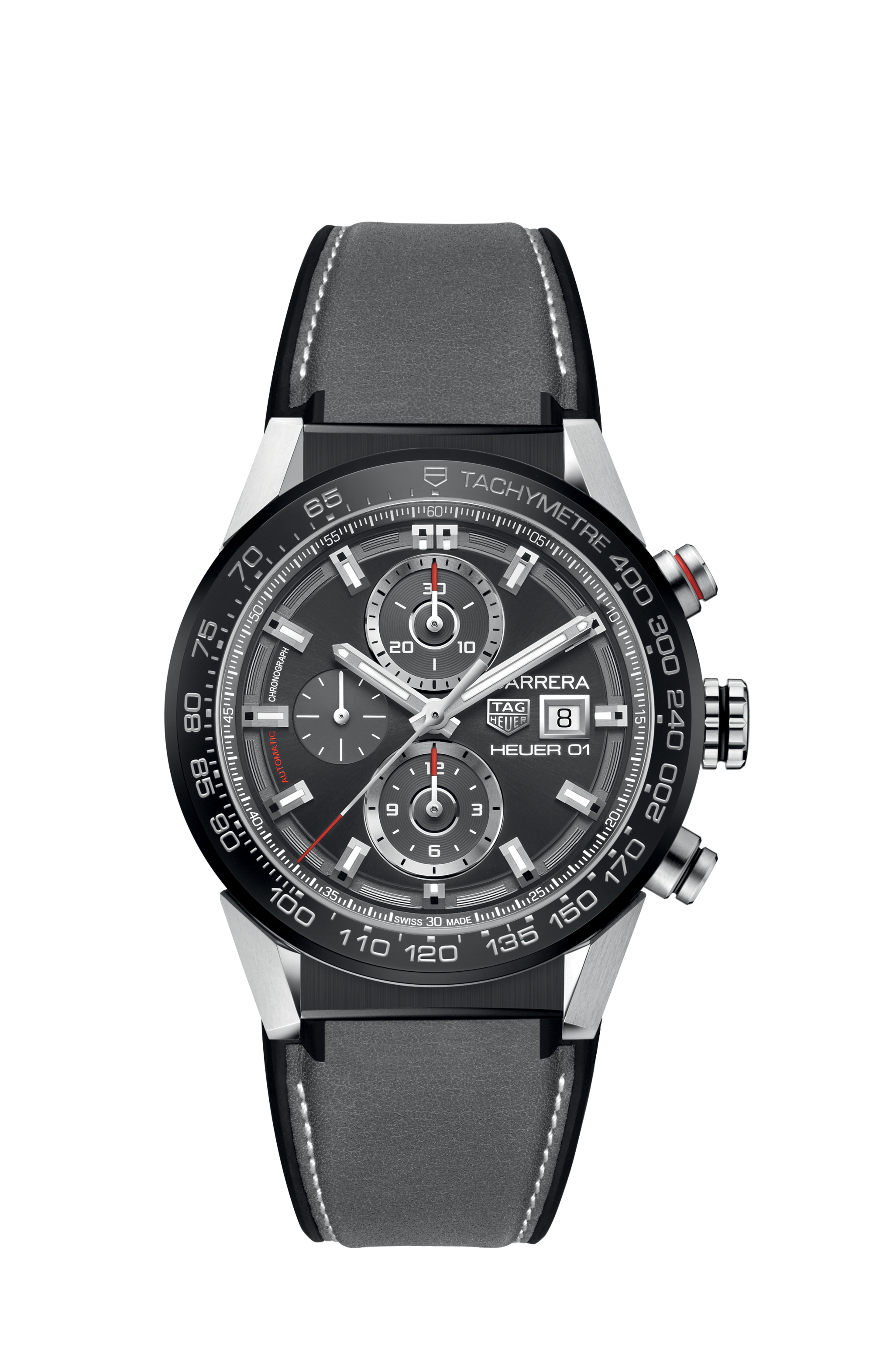 Frutto dell'ingegno svizzero, questo audace TAG Heuer Carrera è un elegante orologio da 43 mm. Questo modello presenta una cassa in acciaio e ceramica e un movimento automatico Calibre Heuer 01.