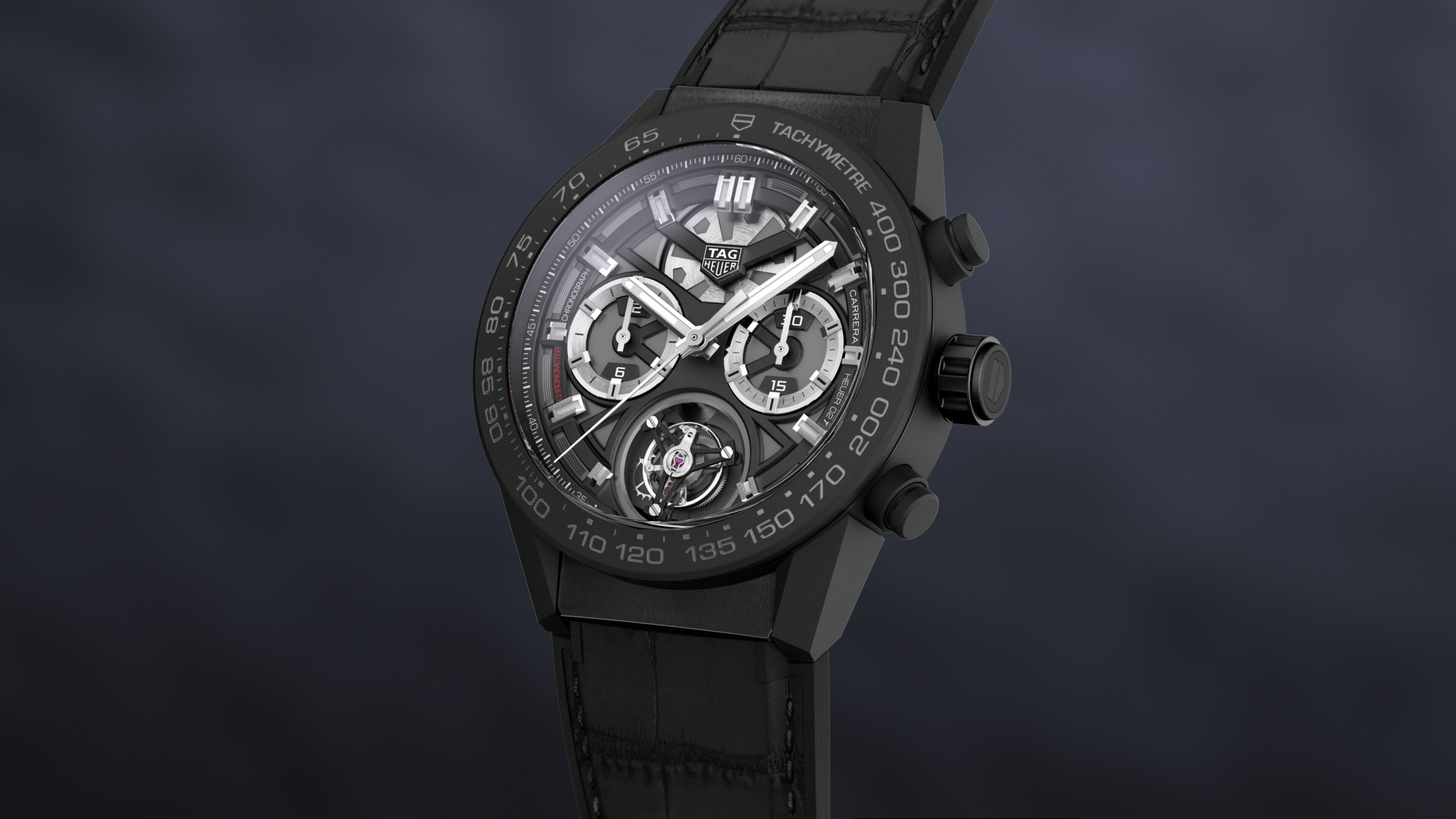 Automatic, 45 mm, Ceramic CAR5A90.FC6415A 45mm matte black ceramic edition of TAG Heuer’s COSC-certified tourbillon chronograph. An exhilarating wrist-worn work of art with open-worked dial, silver-toned subdials and a matte black leather-on-rubber strap.
