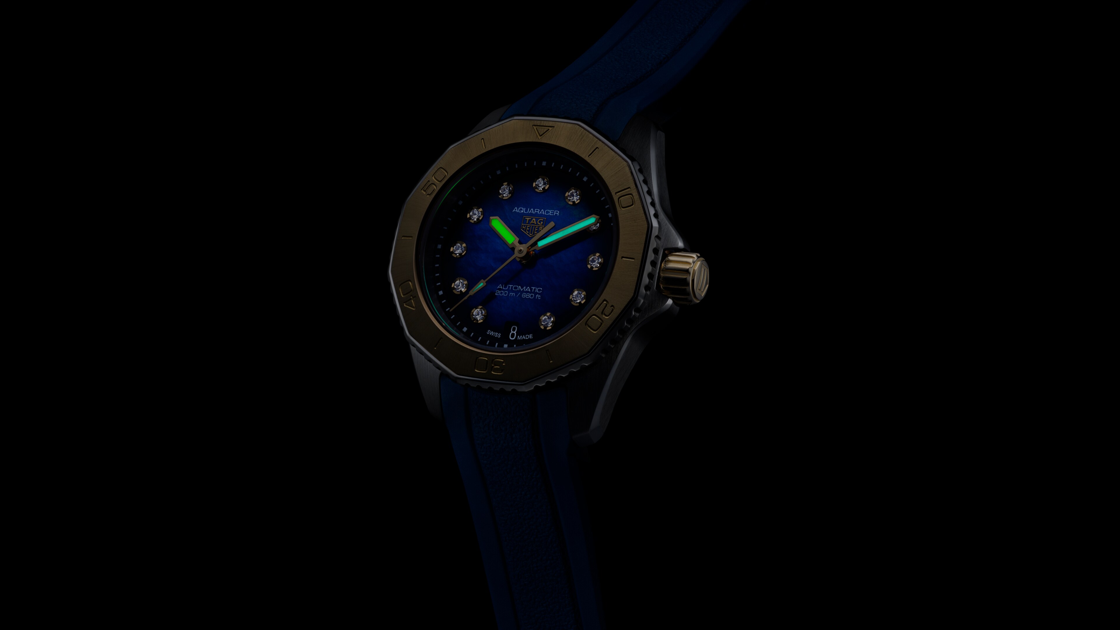 Automatic, 30 mm, Steel WBP2450.FT621518K 3N yellow gold and gleaming VS 1.4mm-diametre diamonds (0.107ct) are at the forefront of this sumptuous TAG Heuer Aquaracer and its smoky-blue mother-of-pearl dial. Water-resistant to 200 metres and equipped with a versatile rubber strap, this watch is set to surpass.