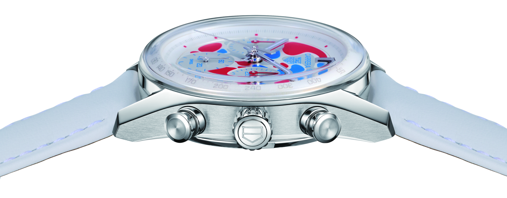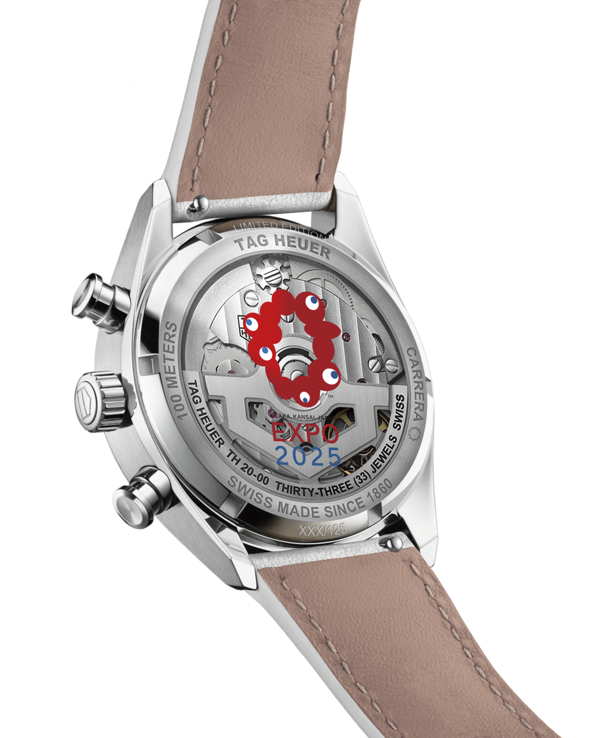 The TAG Heuer Carrera Chronograph Expo 2025 Osaka Limited Edition is powered by the in-house movement TH20-00. Its dynamic dial design echoes the official “Elements” artwork, blending red, blue, and gray in a fluid graphic that celebrates the spirit of innovation and harmony.
