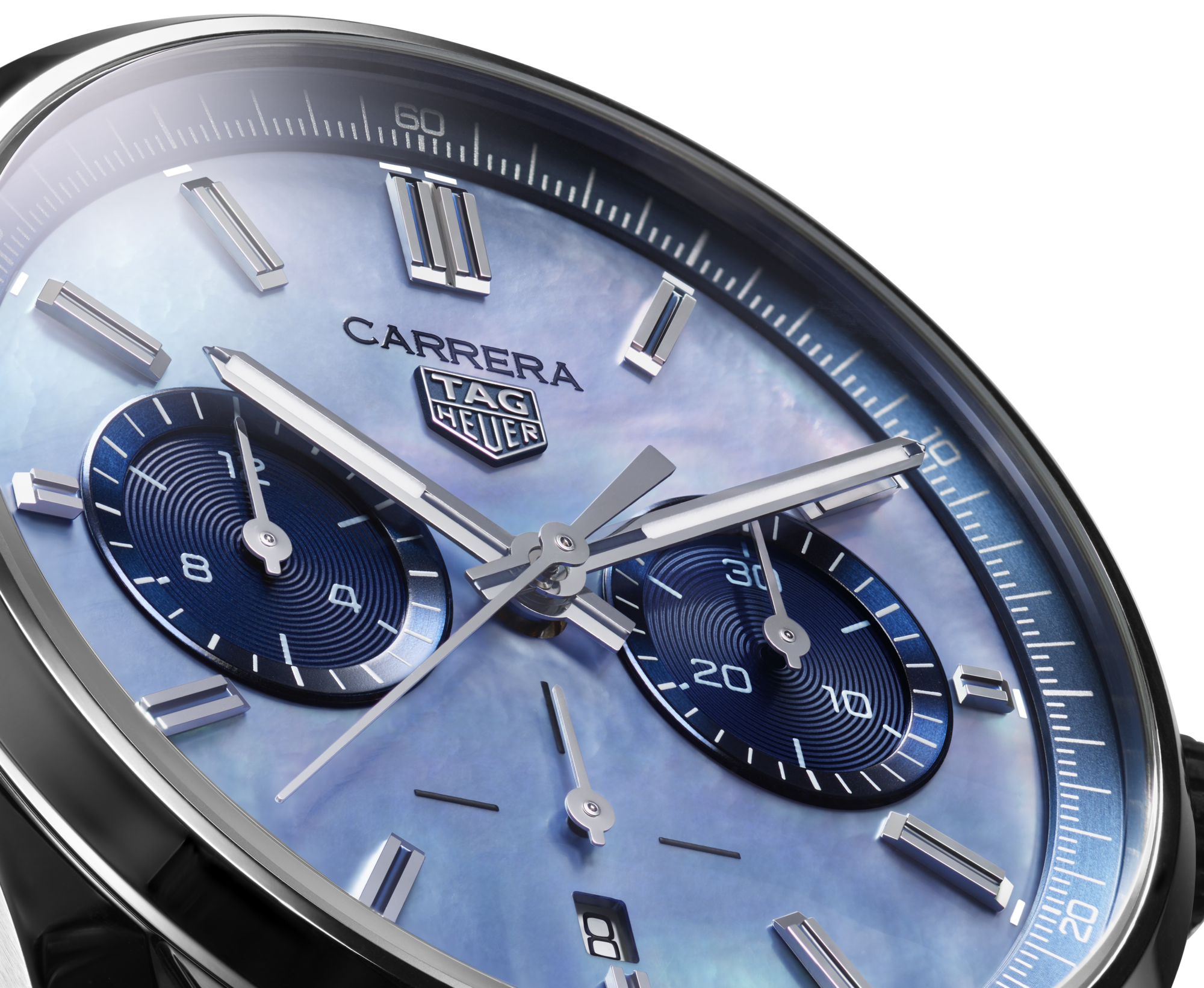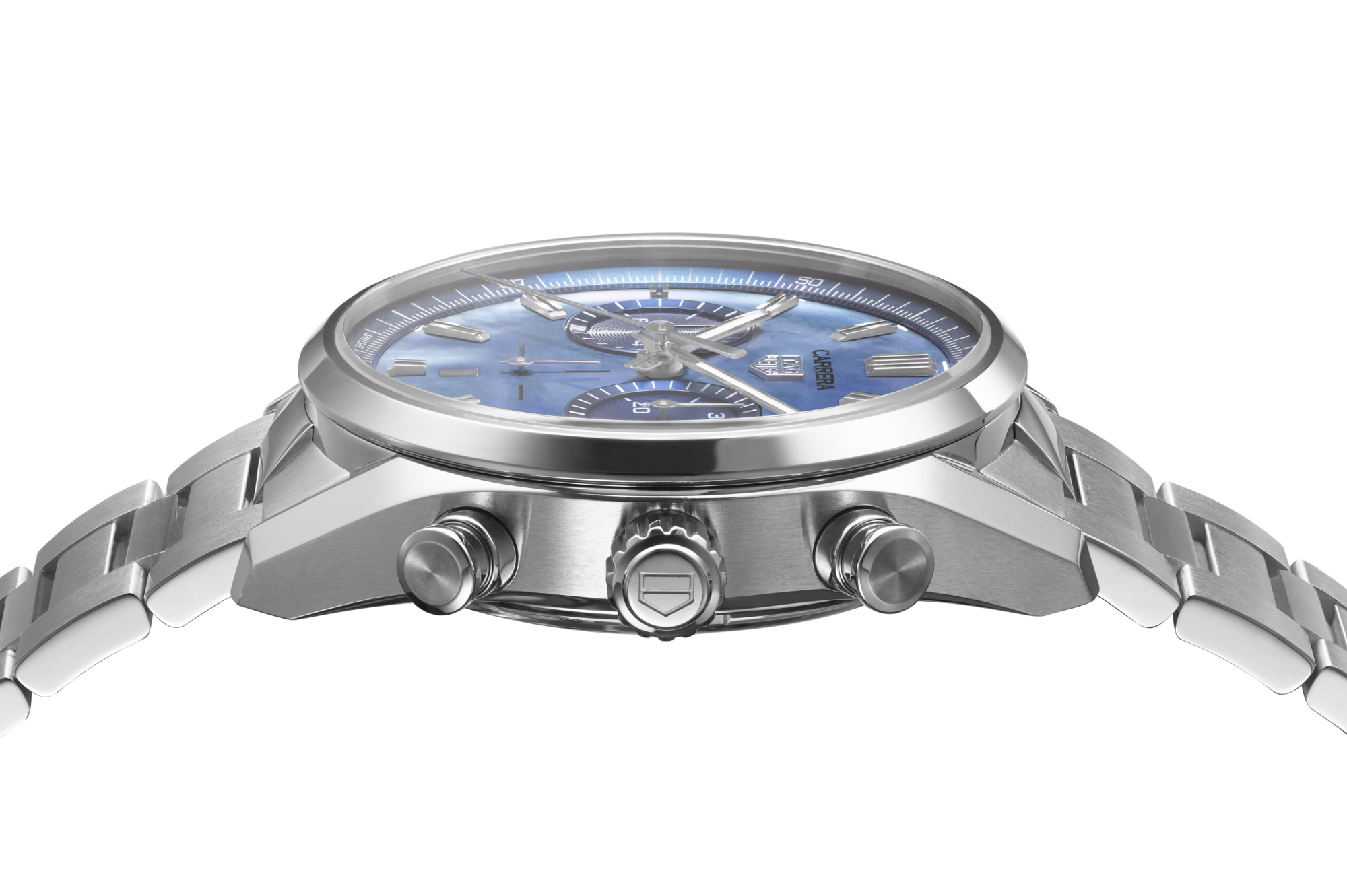 The special engraved light blue mother of pearl dialed chronograph, equipped with multiple precision capabilities, delivered in a JP limited blue box.