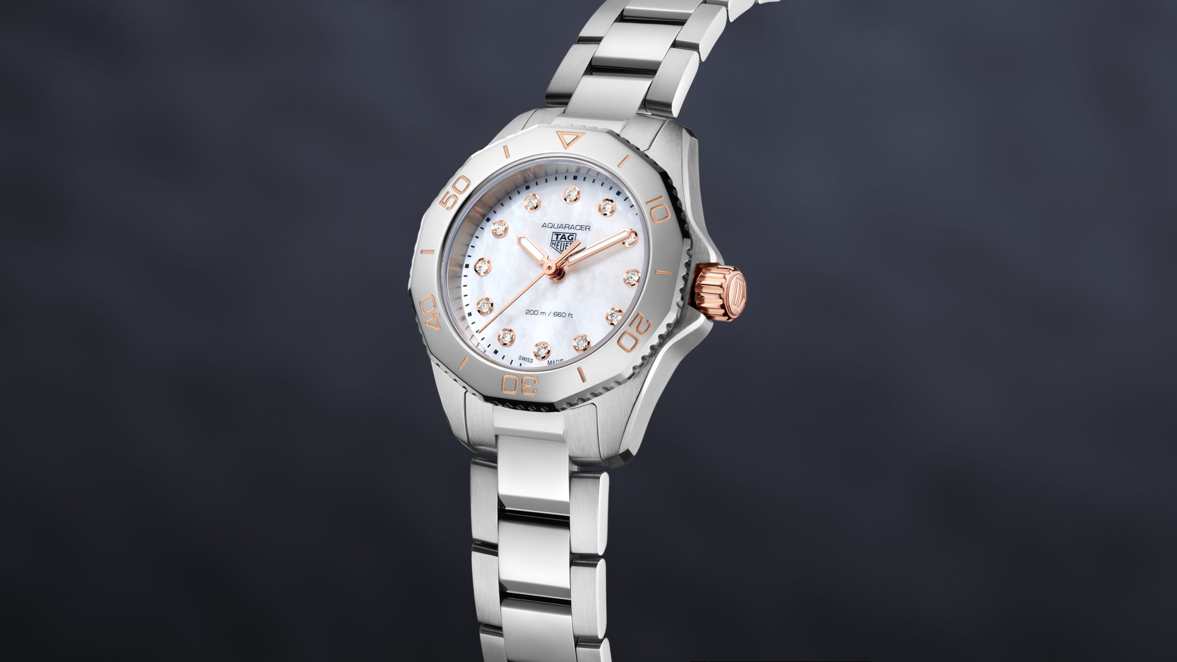 クォーツ, 30 mm, スティール製 WBP1450.BA0622ケースと仕上げを人間工学に基づいて最適化したこのタグ・ホイヤー アクアレーサーは、VSダイヤモンド12個(直径1.40mm / 0.117カラット) を配したマザーオブパールのダイヤルと18Kローズゴールドプレートのリューズを備え、絶対的なエレガンスの輝きを放っています。高い汎用性、信頼性を誇るこのタイムピースがあれば、どんな難関にも自信をもって立ち向かっていけます。