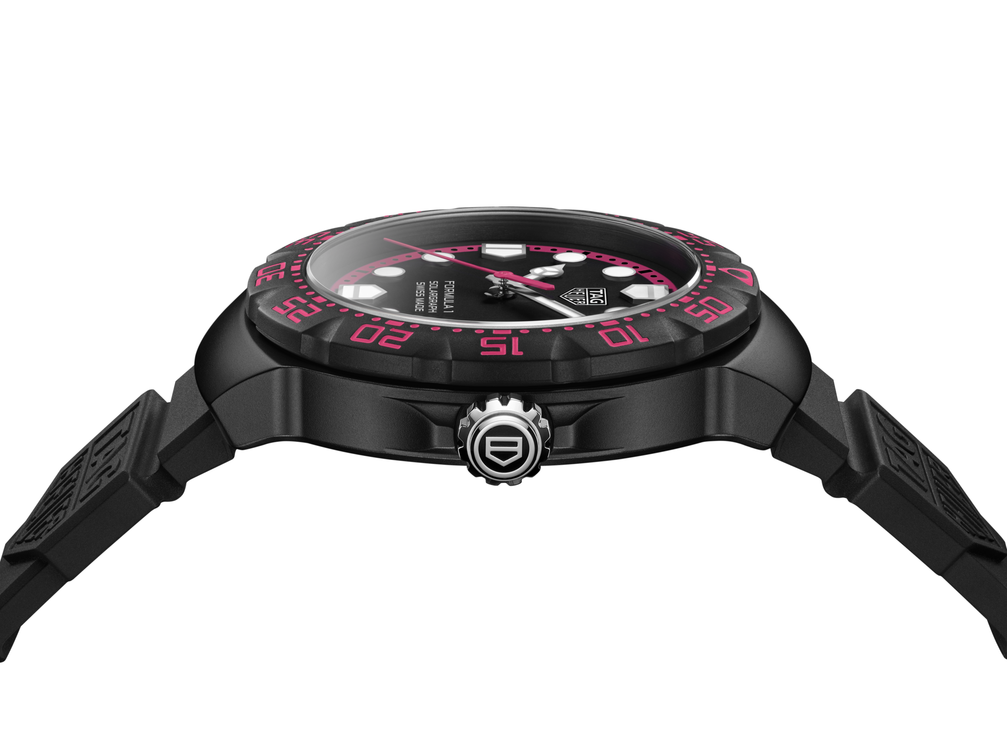 人間工学に基づいて作られた大胆な38mmのタグ・ホイヤー フォーミュラ1 ソーラーグラフ。高性能のエンジニアリングに目を引くピンクのアクセントを添えたデザインです。スポーツ、スタイル、ソーラーパワーのパフォーマンスを融合した、一瞬一瞬を謳歌する人のためのウォッチです。