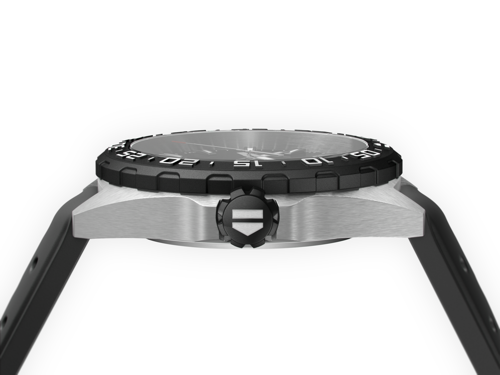 サテン仕上げスティール製ケースにブラックのダイヤルを備えた、男性向けスポーツウォッチ。サテン仕上げステンレススティール製の41mmケースに、ブラックPVDステンレススティール製逆回転防止ベゼルとねじ込み式リューズを組み合わせています。スポーティで都会的、そして大胆なルックスです。