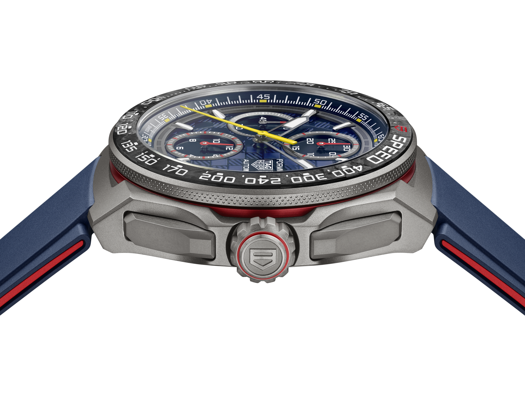 フォージドカーボン製ベゼルを備えた、耐久性に優れるグレード2チタン製44mmケースは、強度と軽量性を両立。汎用性の高いブルーラバーストラップが組み合わされているので、レーストラックの中でも外でも、タフな挑戦にも立ち向かっていけます。