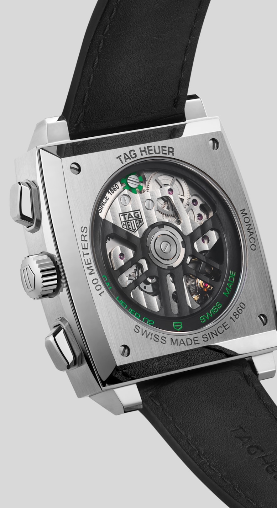 自動巻, 39 mm, ステンレススティール CBL2116.FC6497タグ・ホイヤー モナコ グリーンダイヤルは、タグ・ホイヤーが公式スポンサーおよびタイムキーパーを務めるグランプリ・ドゥ・モナコ・ヒストリックにオマージュを捧げるモデルです。今までになかった深みのある繊細なグリーンが、フレッシュな印象を与えます。鼓動を打つ自社製ムーブメントのローターとコラムホイールに施された刻印も、同じくグリーン。時計愛好家を魅了する、世界500本のリミテッドエディションです。