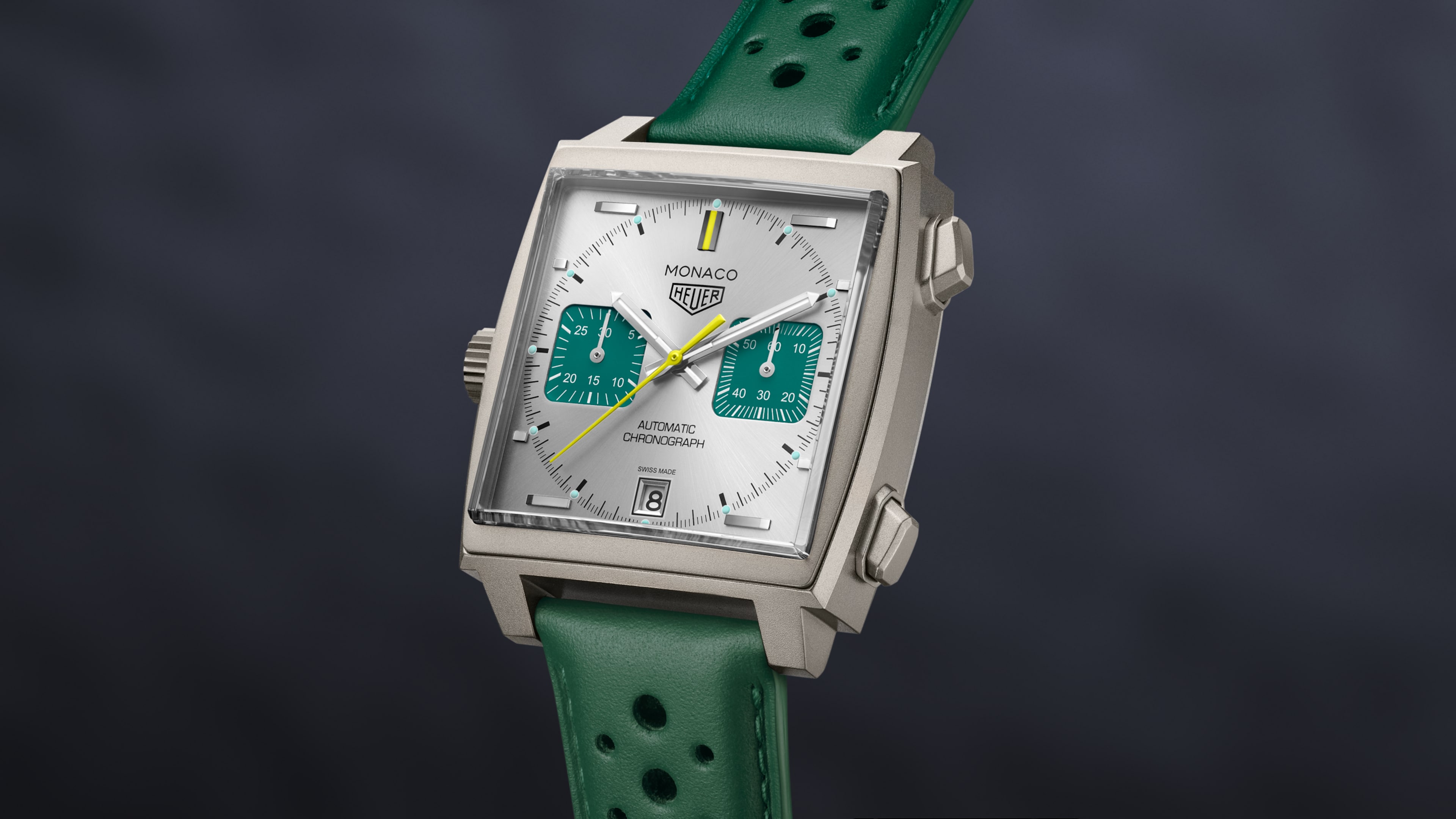サンレイ加工サテン仕上げのシルバーダイヤルが、1920年代~ 30年代のスポーツカーに見られるダッシュボードを思わせ、グリーンオパーリンのカウンターと鮮やかなイエローのハイライトが伝統的な英国のモーターレースを彩るカラーにオマージュを捧げています。