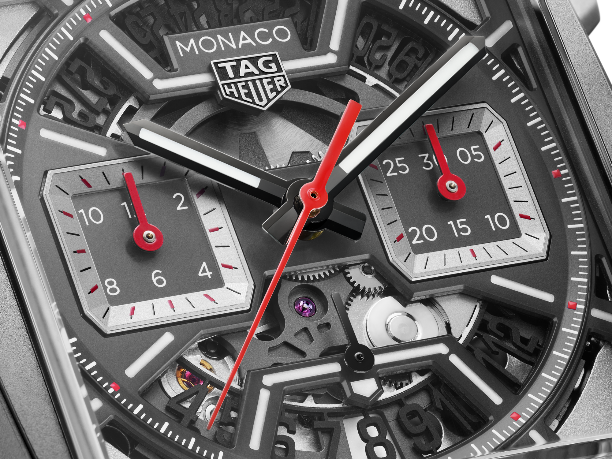 サンドブラスト加工を施したブラックのオープンワークダイヤルにはレーシングレッドとホワイトのハイライトがあしらわれ、モーターレーシングにインスピレーションを得たタイムピースに挑戦的なエッジを添えています。